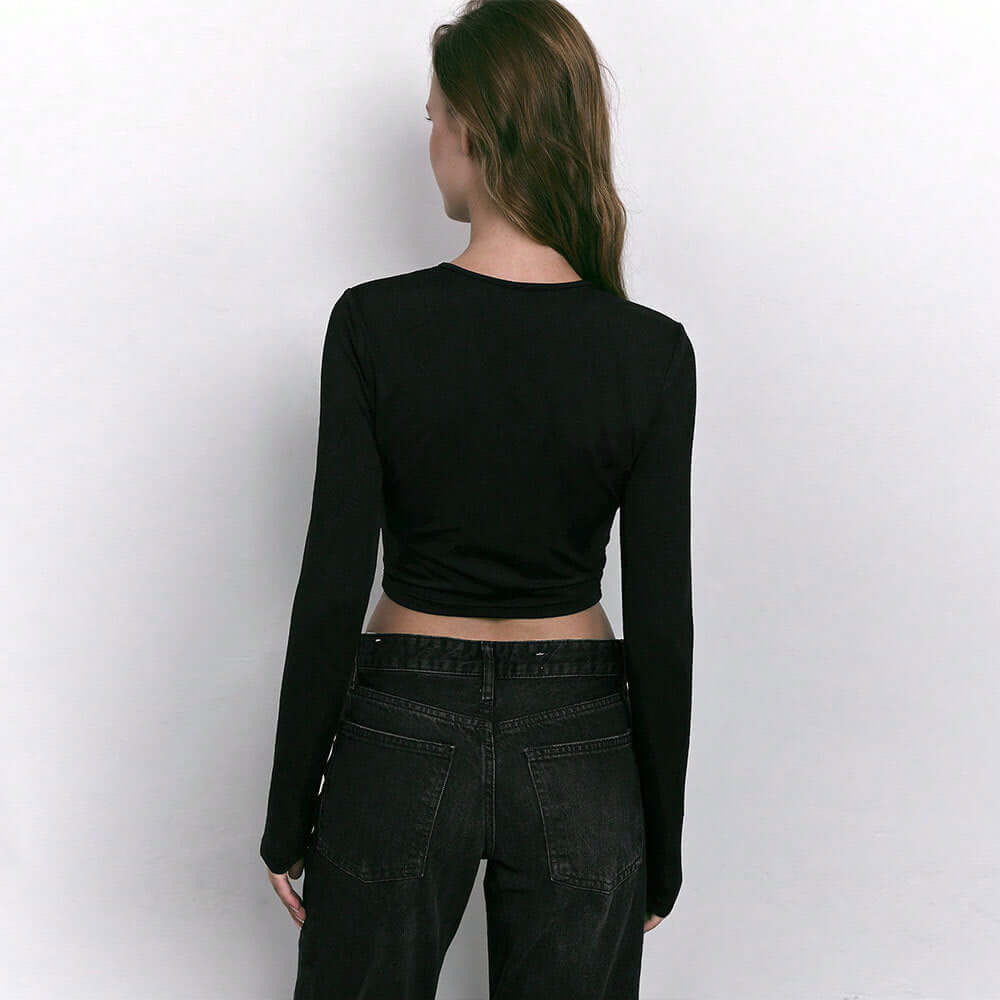 - Dehnbare, schmal geschnittene, kragenlose Cropped-Bluse mit langen Ärmeln für stilvolle, bequeme und moderne Streetwear-Looks.