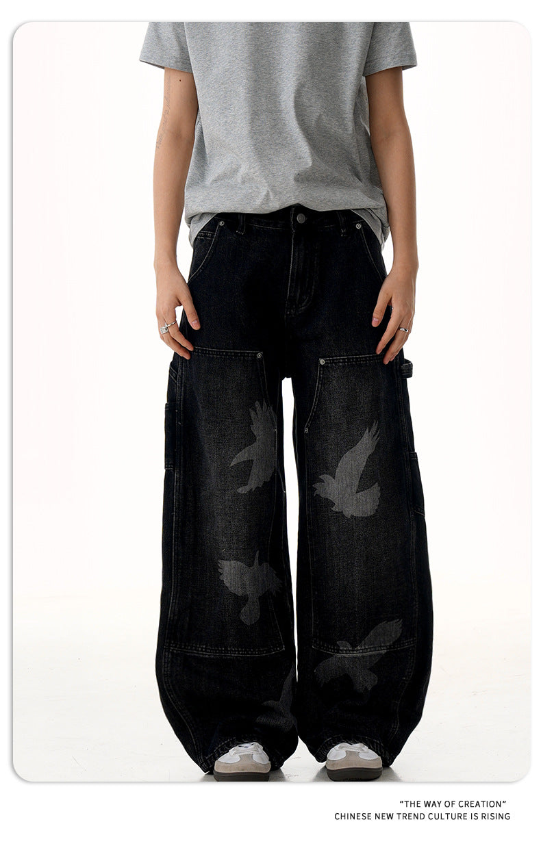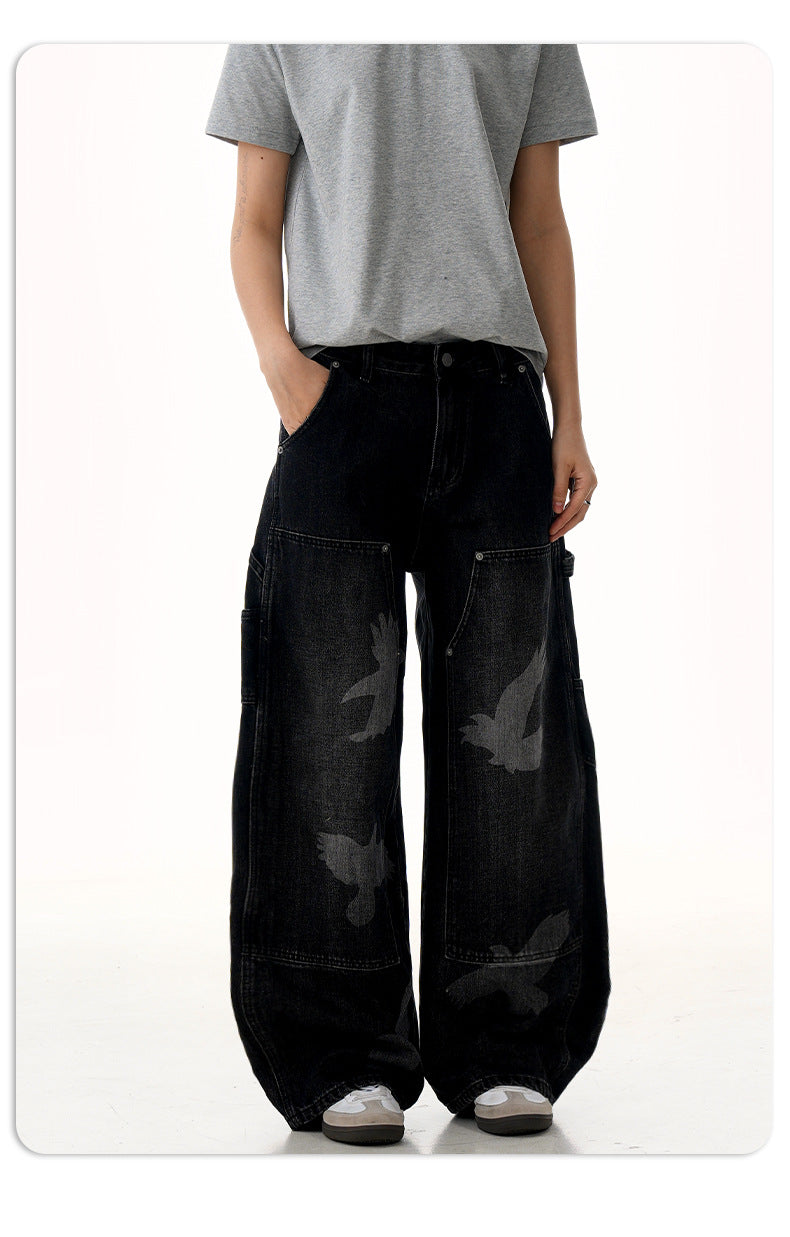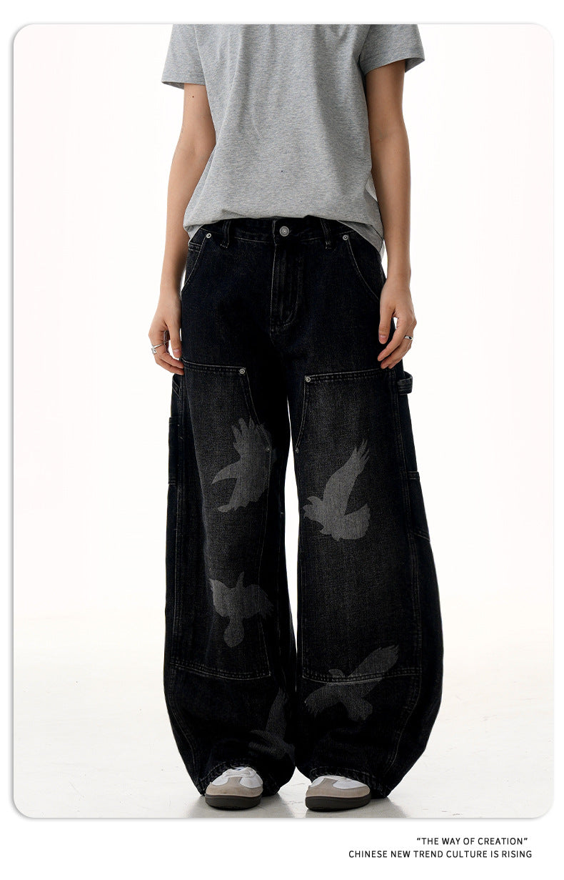 Loose-fit high-waist pigeon print denim jeans with wide straight legs for bold, comfortable unisex streetwear in all seasons.
