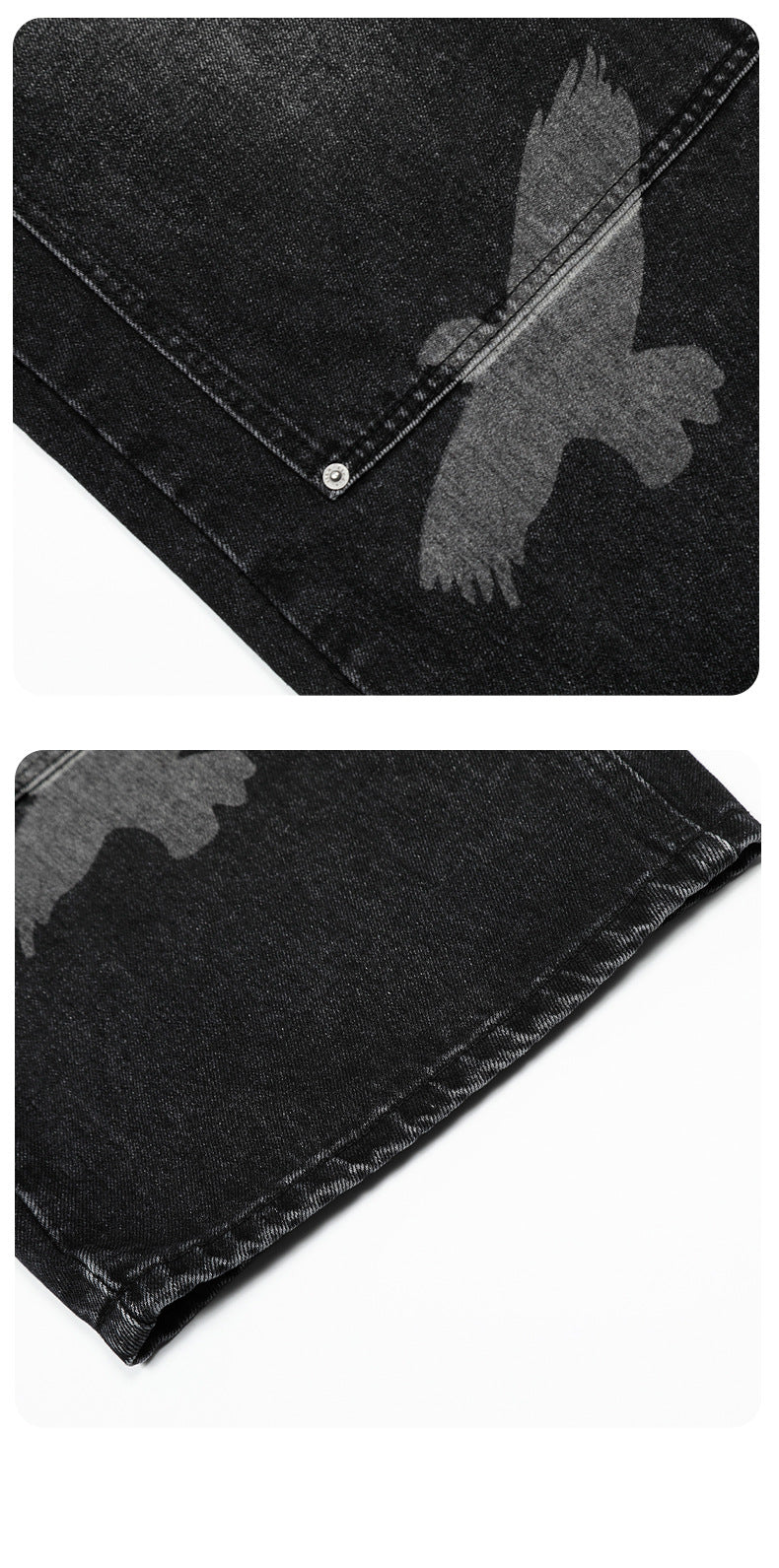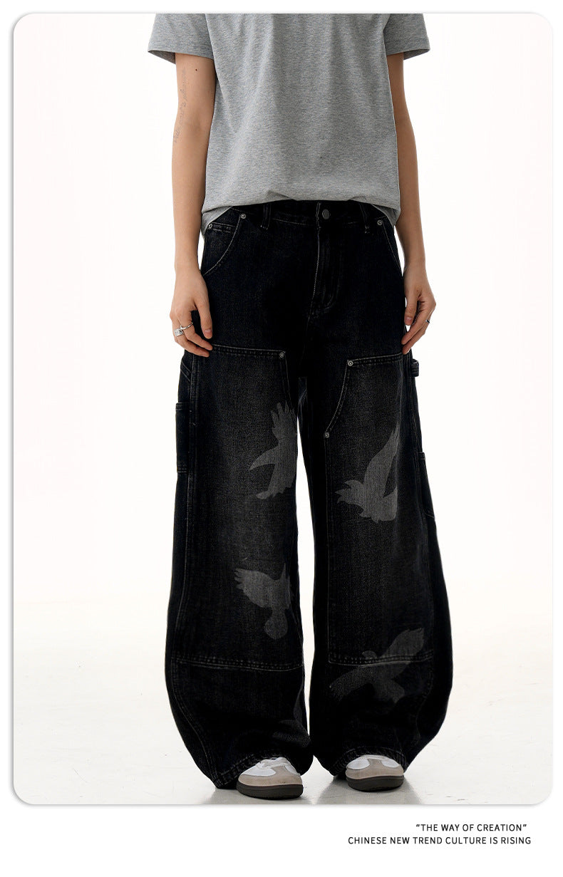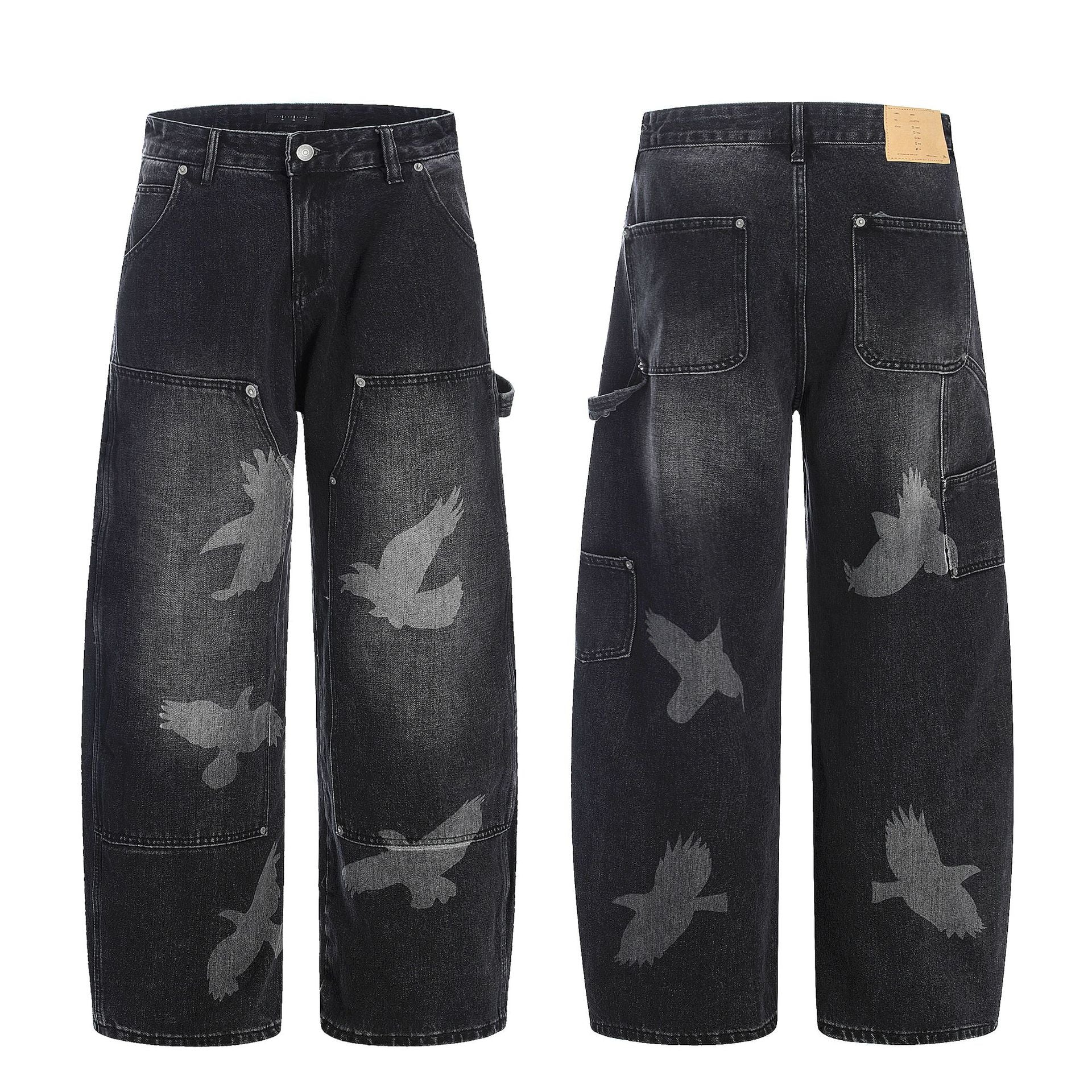 Loose-fit high-waist pigeon print denim jeans with wide straight legs for bold, comfortable unisex streetwear in all seasons.
