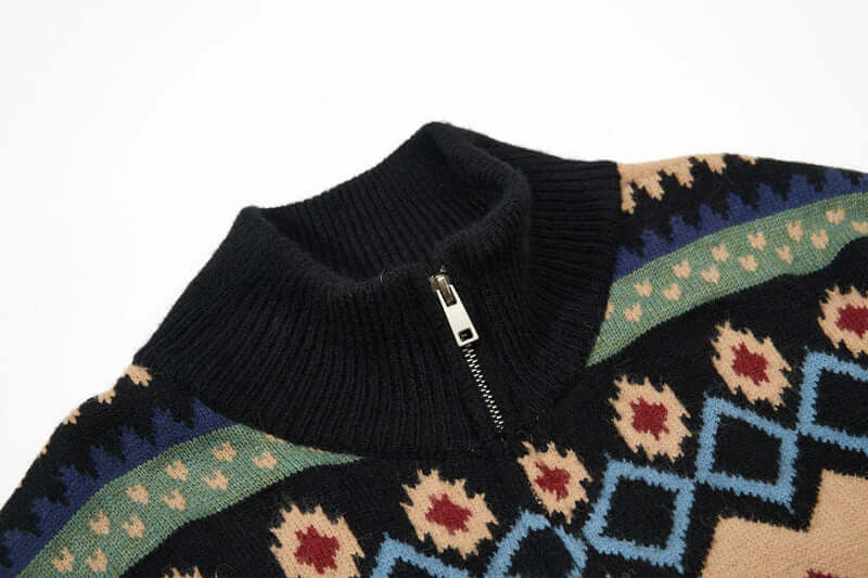 Mit seinem Reißverschluss-Stil und modernen Farboptionen in Schwarz und Aprikose lässt sich die Grozavu Fair Isle Strickjacke mühelos mit Jeans, Cargohosen oder Jogginghosen für selbstbewusste unisex Street-Outfits kombinieren.
