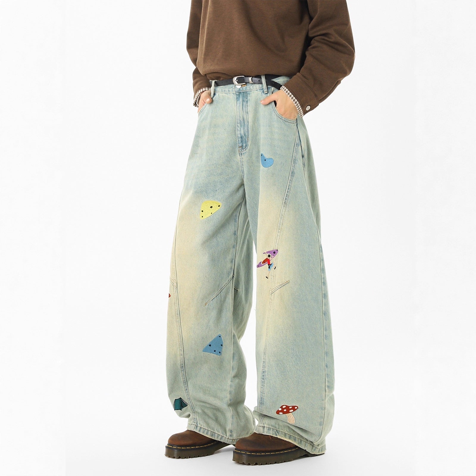 Streetwear Fun Patchwork Jeans Men Trendy Deconstructed Embroidered Knife Pants Clean Fit Washed Straight Leg Jeans