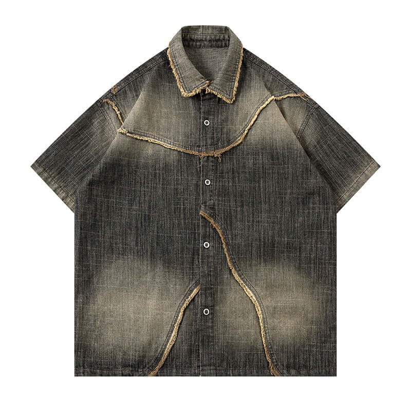 • Breathable loose-fit pure cotton gradient denim shirt with color-block design and short sleeves for comfortable unisex casual streetwear.