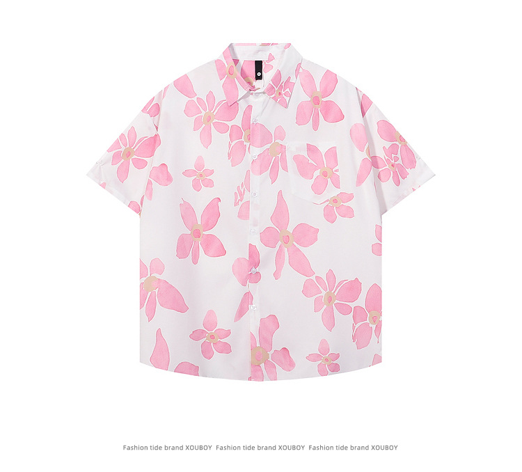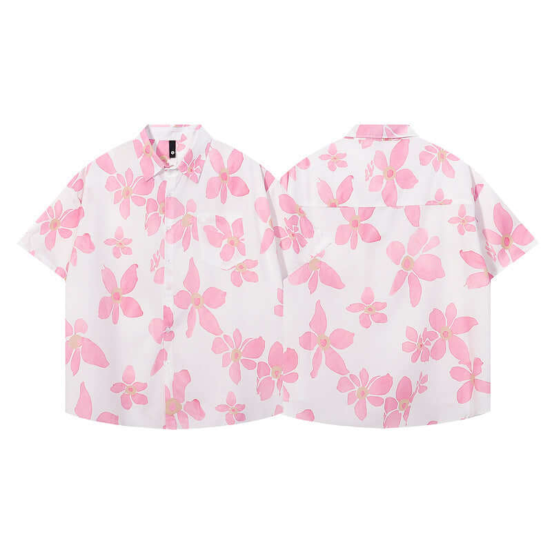 • Pink Floral Short Sleeve Shirt – Loose Fit with pink and white floral pattern, perfect for summer casual wear.