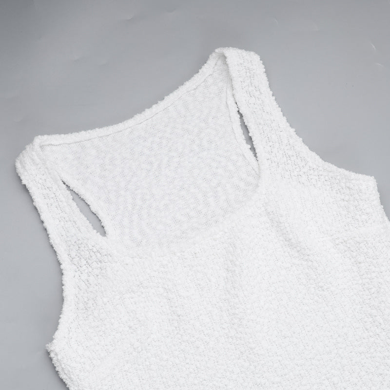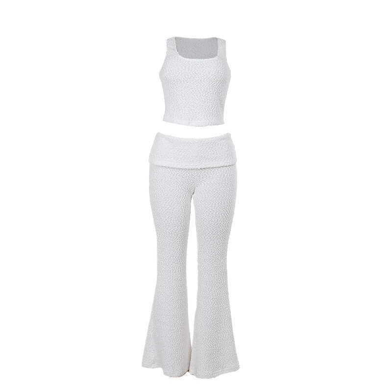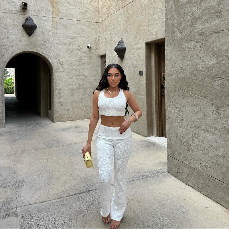 • Lightweight loose-fit textured vest and long pants set with stretch fabric for elegant, breathable, and versatile daily wear.