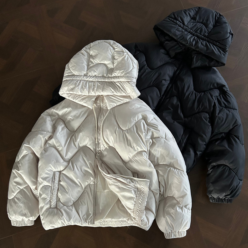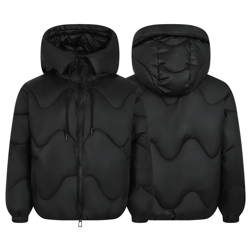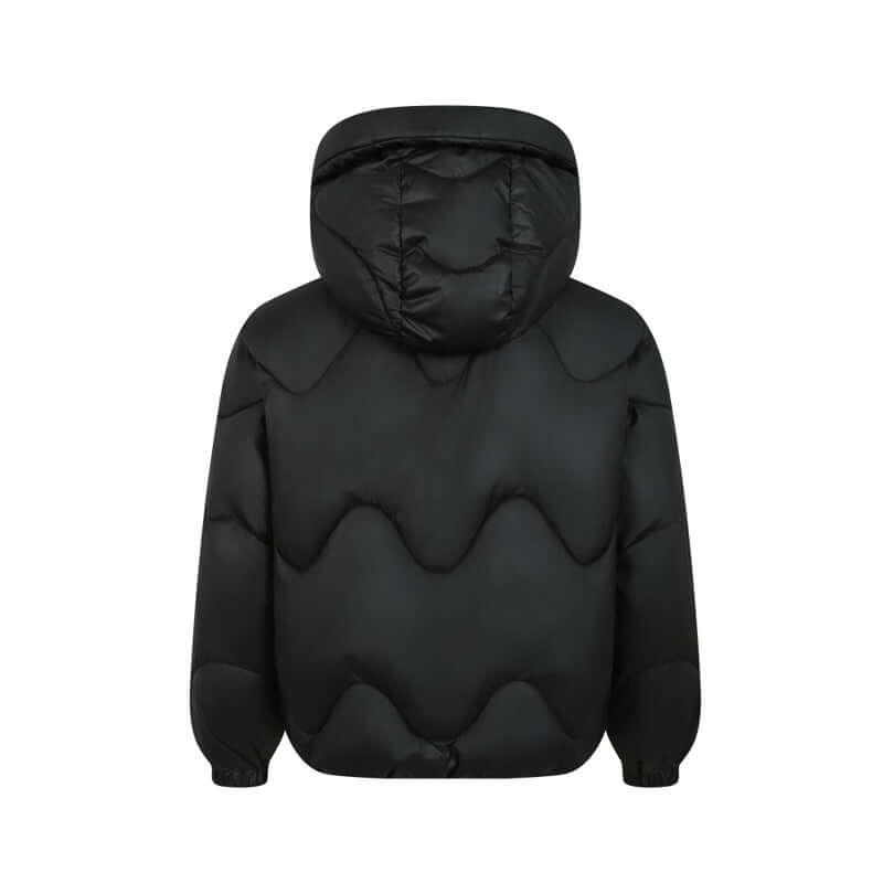 • Wave Design Puffer Coat – Loose Fit in black with distinctive wave pattern and hooded style.