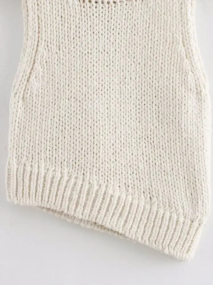 La Grozavu Asymmetrical Chain Knit Tank Top es una pieza atrevida y de moda callejera inspirada en la moda europea y americana. Diseñada con un corte asimétrico llamativo, detalle decorativo de cadena de metal y escote redondo, este chaleco sin mangas crea una silueta moderna y vanguardista.