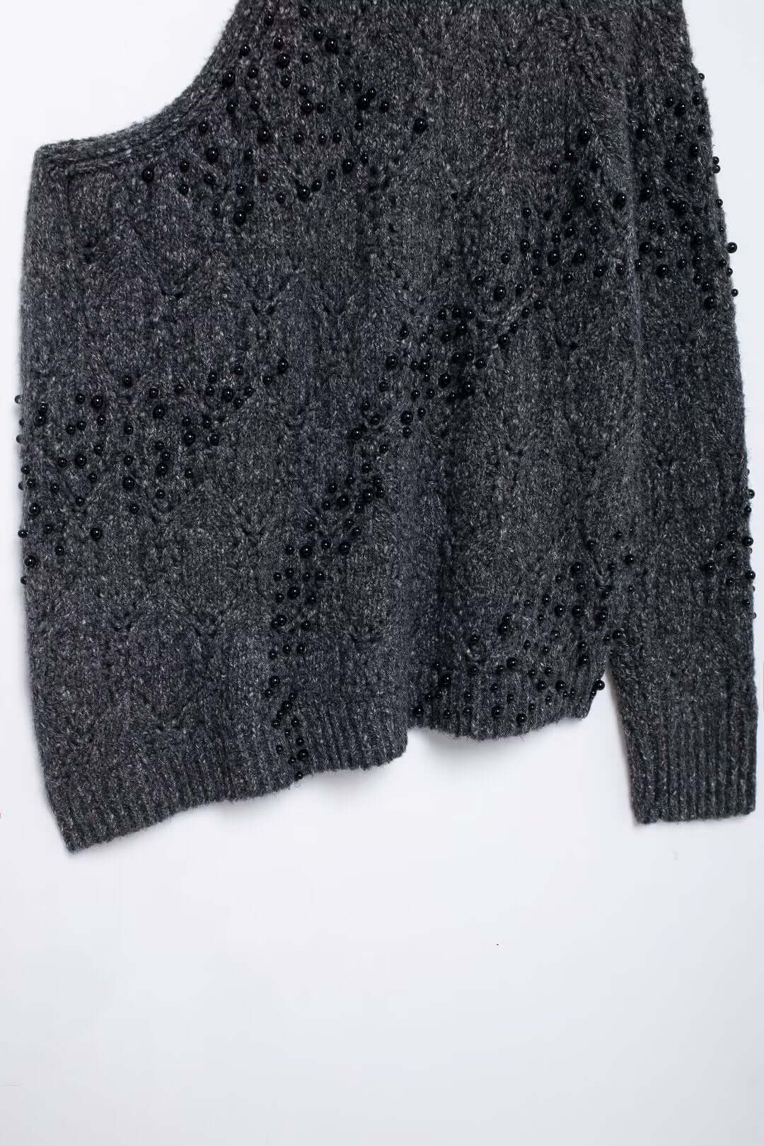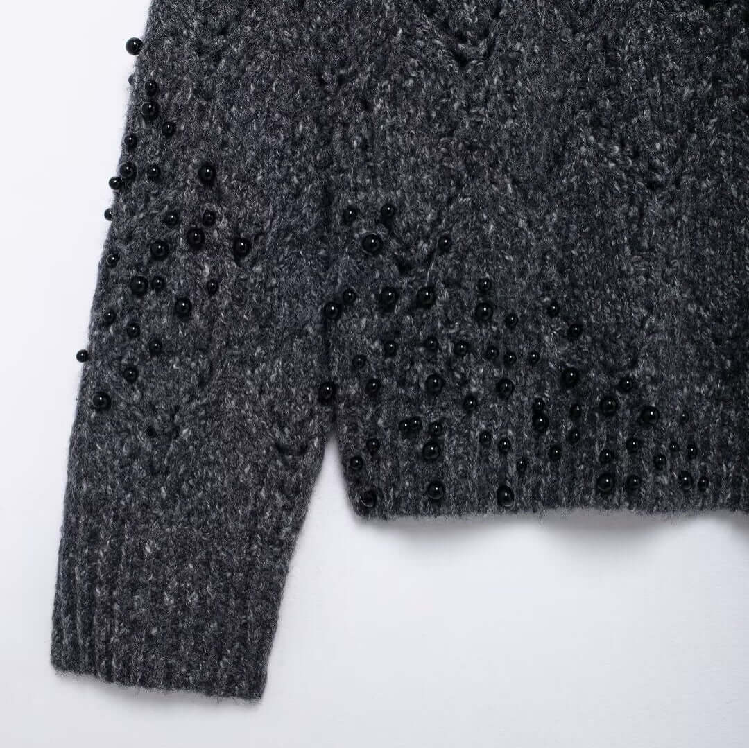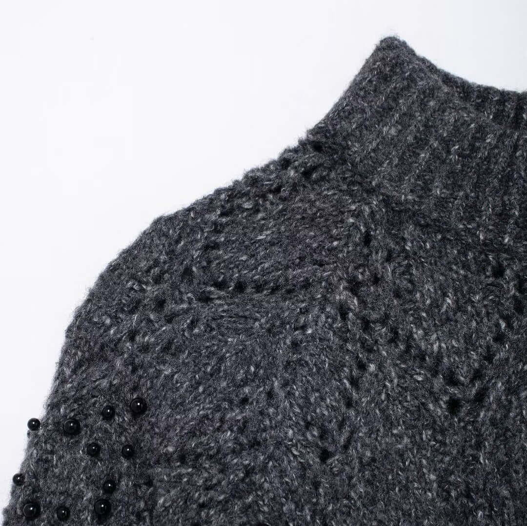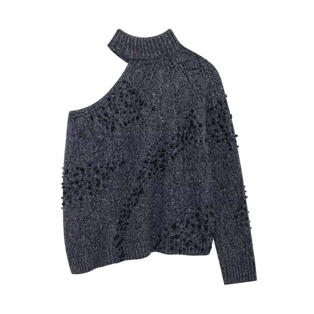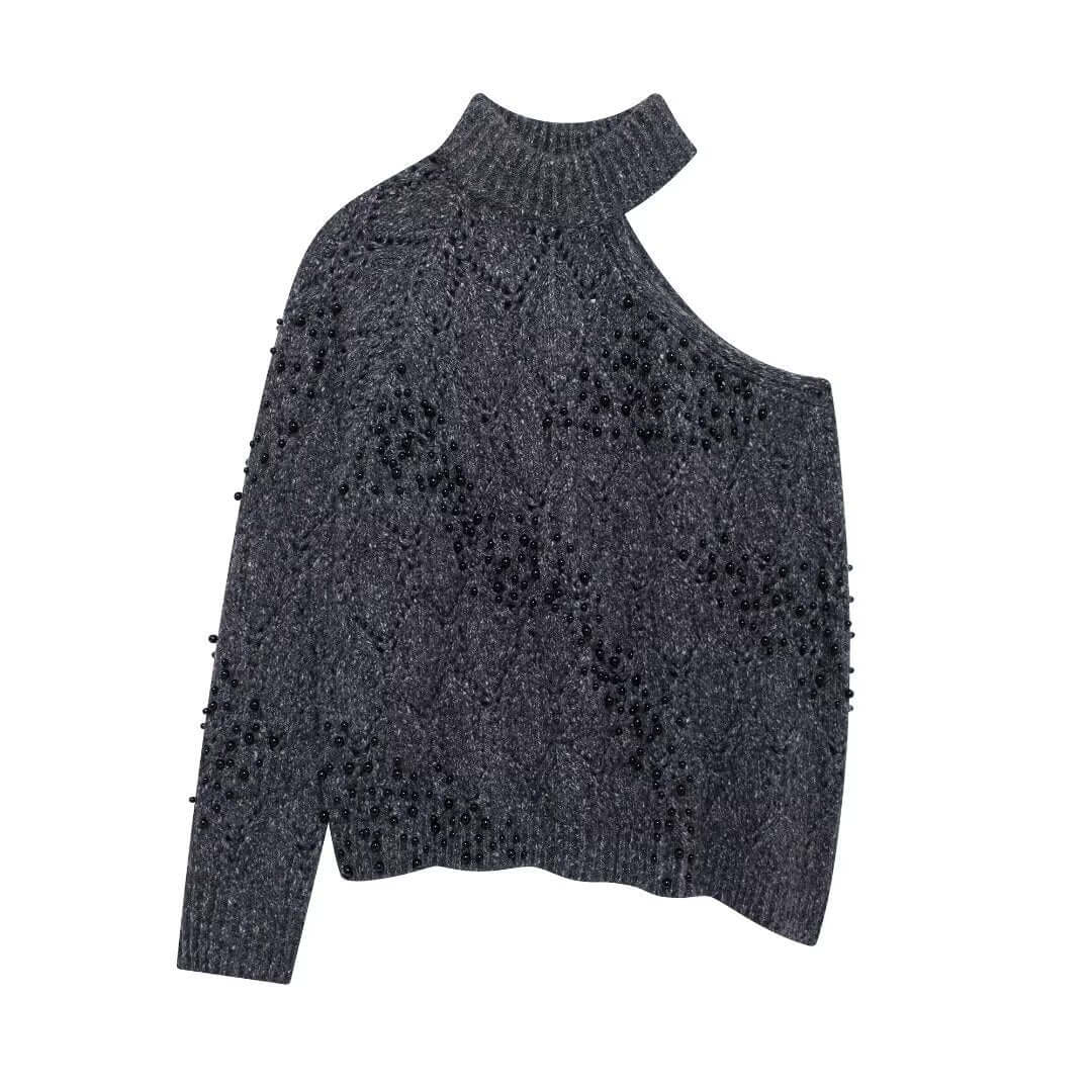 El suéter de punto asimétrico de hombro caído Grozavu está diseñado para mujeres modernas que aman la moda europea y americana elegante con un giro audaz. Con una abertura de hombro estilosa, decoración de cuentas huecas y un cuello tipo half turtleneck, este suéter crea un look en capas chic que destaca sin esfuerzo.