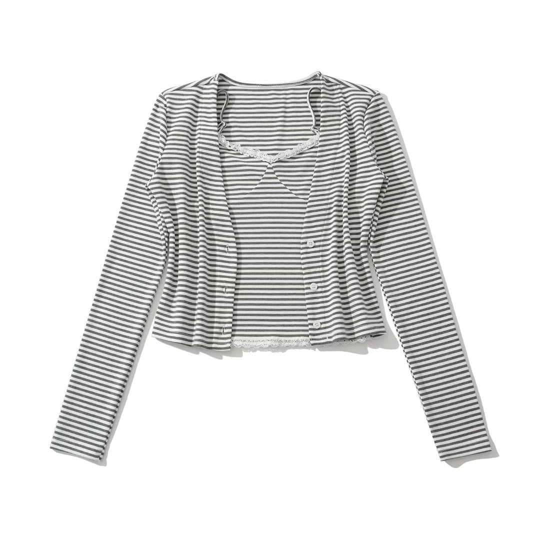 Estilo: Dulce & FrescoTipo de Patrón: RayasElemento de Diseño: EncajeProceso: EmpalmeColor: Conjunto de dos piezas a rayas grises, Conjunto de...