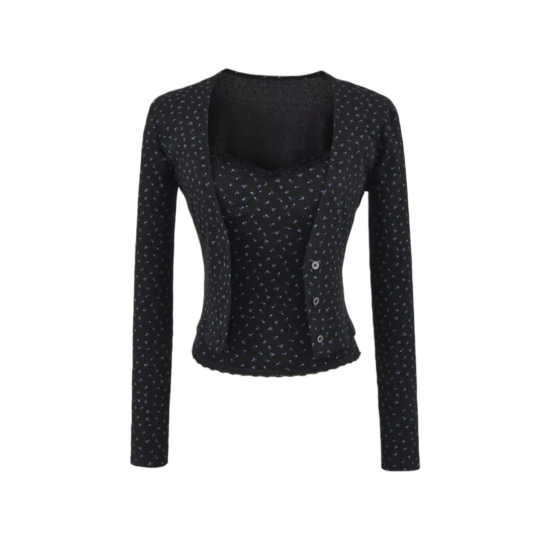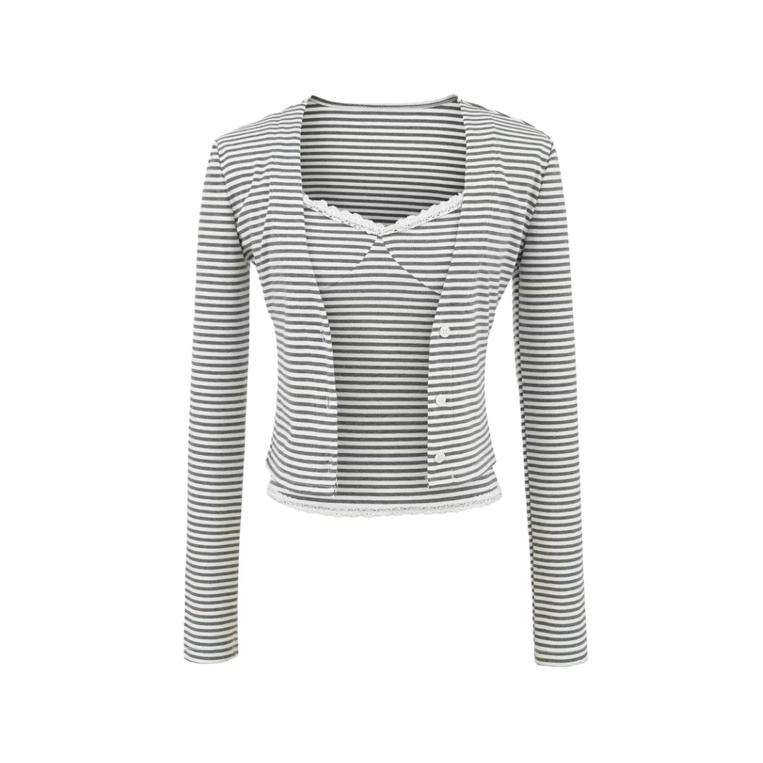 Top de Cárdigan de Manga Larga con Cuello en V a Rayas Dulces para Mujeres con Cuello Volante, Conjunto de Camisón Ajustado de Parches
