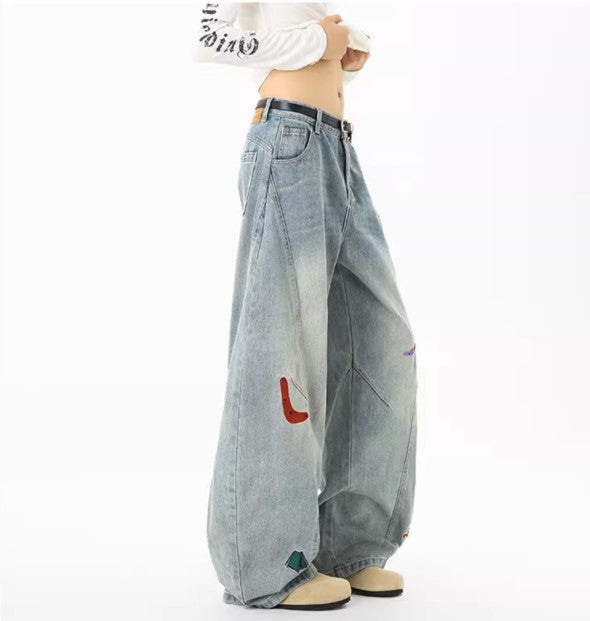 Embroidery, Patchwork/Splicing, Topstitching, Washed finish, Distressed design, Loose fit, Long length, Button fly, Mid-rise waist