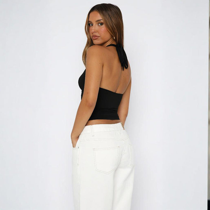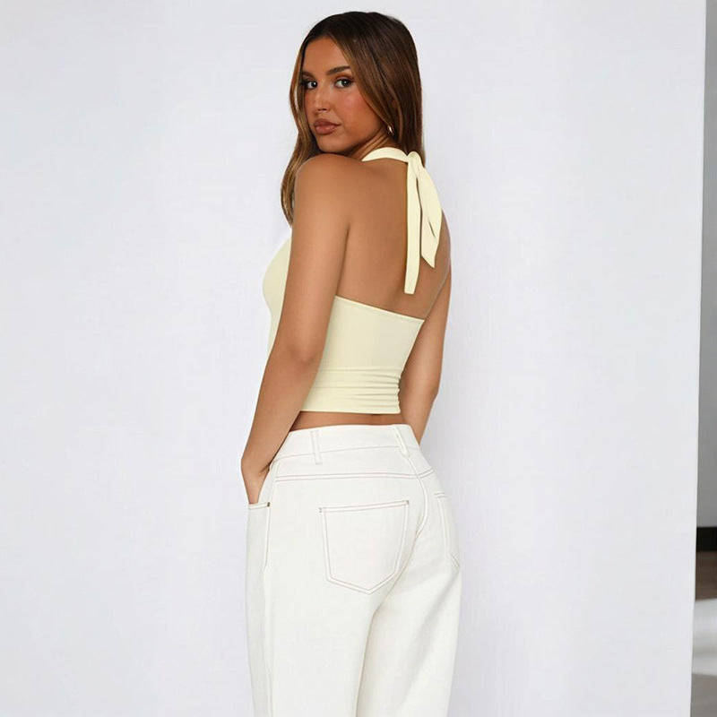 - Chaleco ajustado de tirantes con cuello halter y tejido suave para un estilo urbano de verano sexy, transpirable y cómodo.