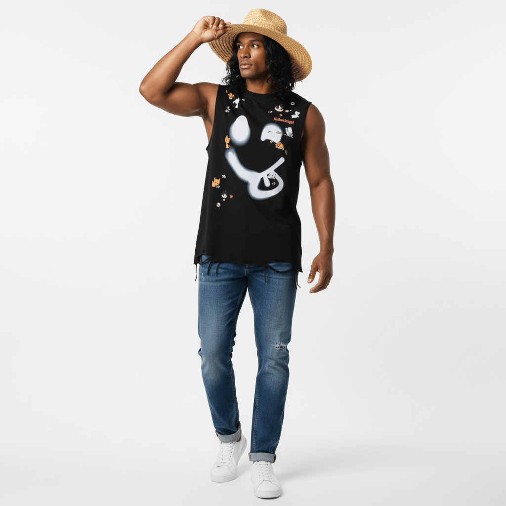 La camiseta sin mangas con estampado de graffiti Smiley entrega una energía urbana audaz con un toque rebelde. Diseñada con...
