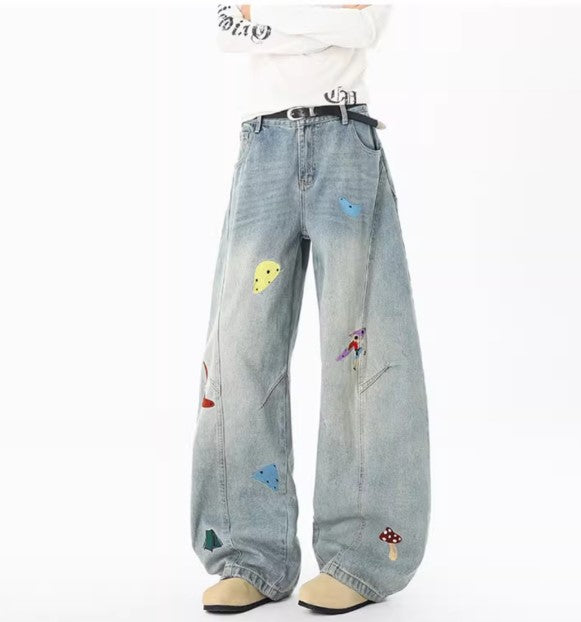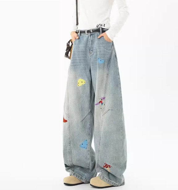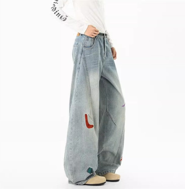 Embroidery, Patchwork/Splicing, Topstitching, Washed finish, Distressed design, Loose fit, Long length, Button fly, Mid-rise waist