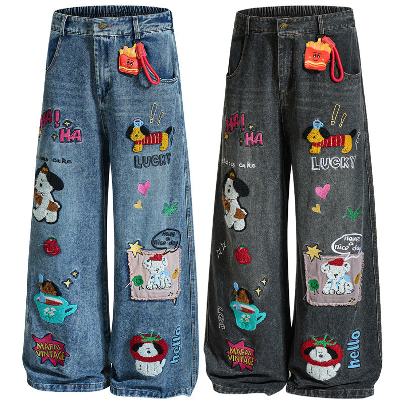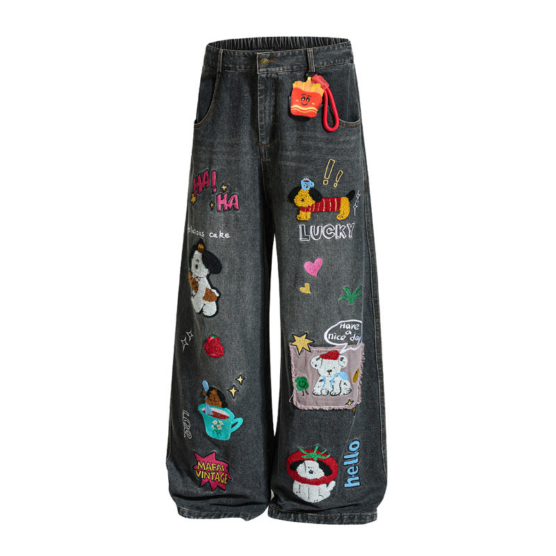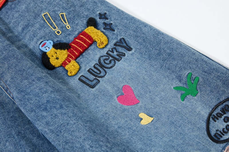 Embroidered College Style Cartoon Patch Denim Pants Bring playful energy to your streetwear lineup with these Grozavu college-style cartoon patch...
