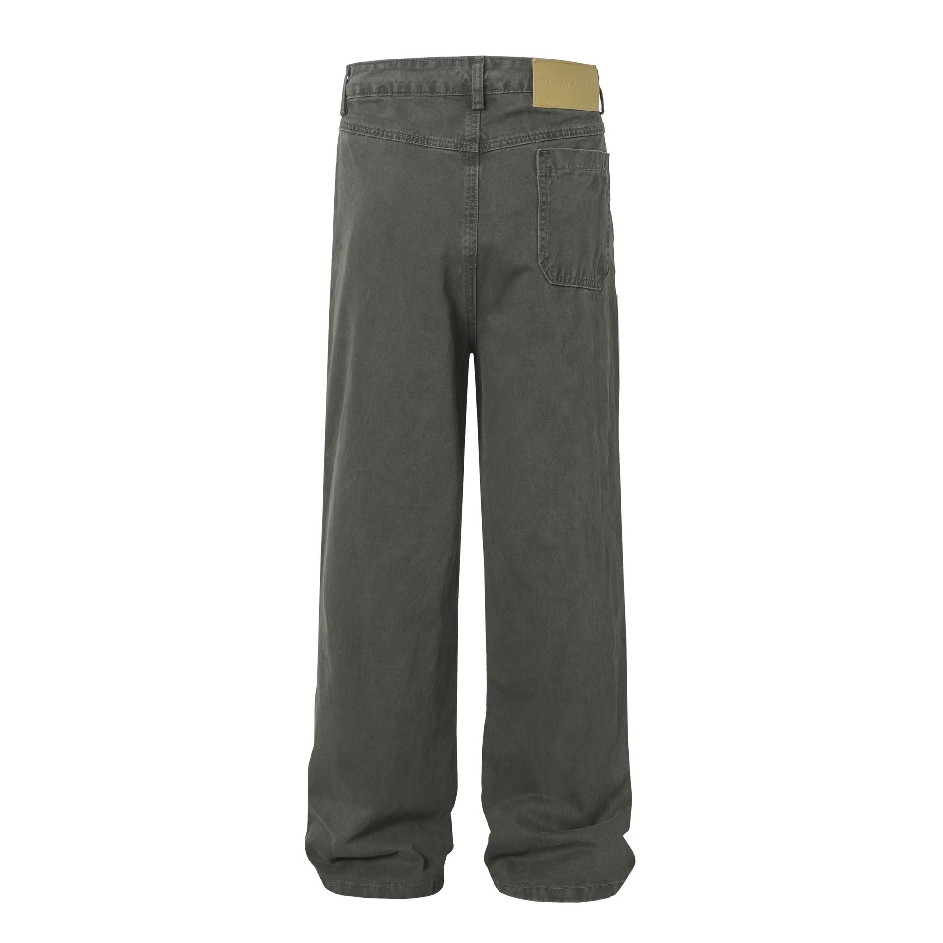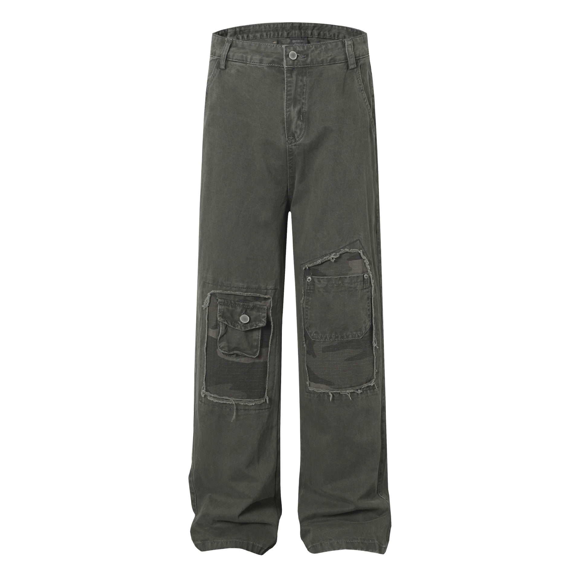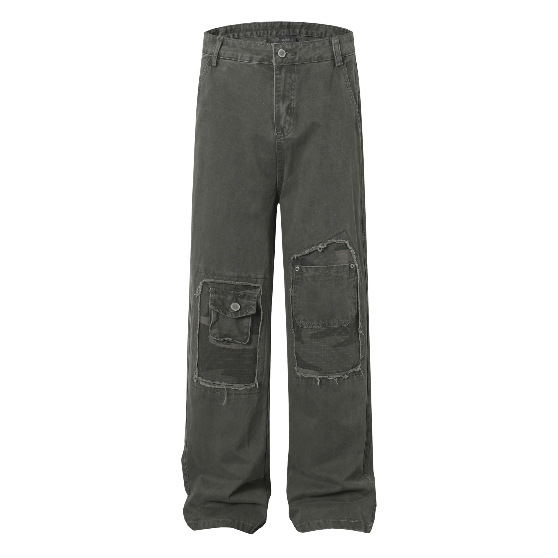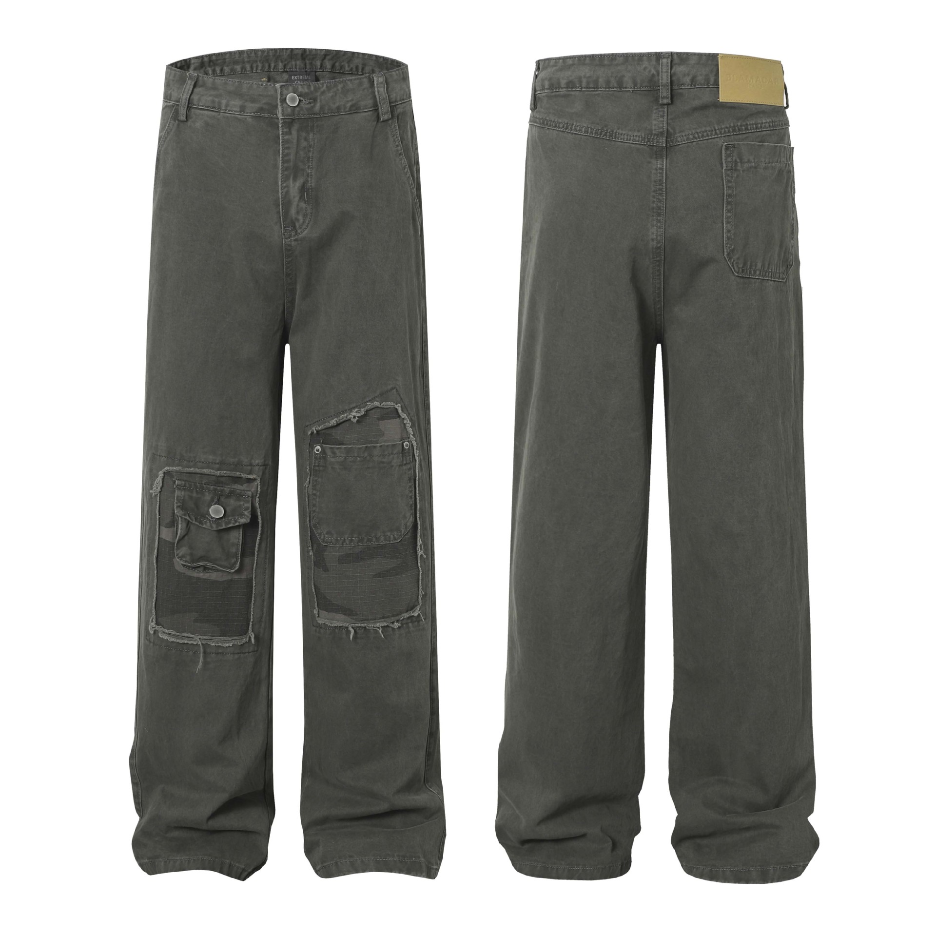 High Street Washed Distressed Patch Pocket Decorated Denim Pants Unisex Loose Long Trousers