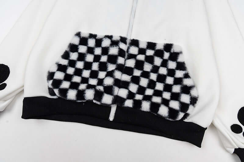 Restez confortable et élégant avec le cardigan à capuche en polaire à patchwork à carreaux avec oreilles de lapin, conçu pour les femmes qui aiment les vêtements d'extérieur ludiques et remarquables. Avec des détails en forme d'oreilles de lapin sur la capuche et une silhouette ample, ce hoodie en polaire épaisse est parfait pour un superposition décontractée lors des jours plus froids.