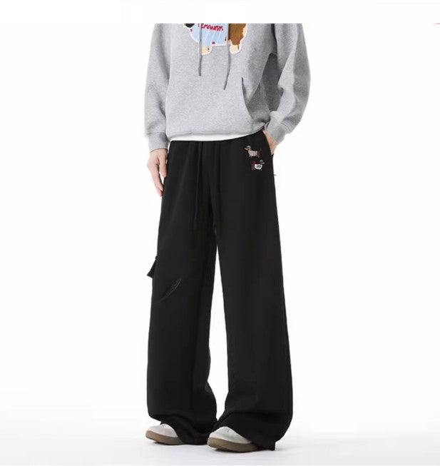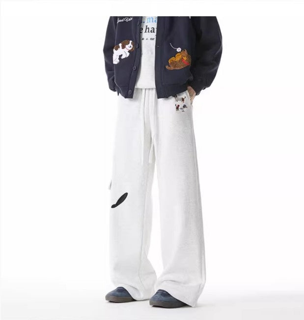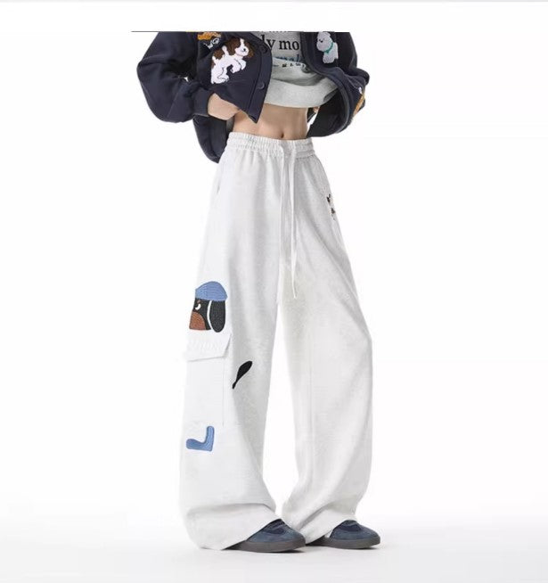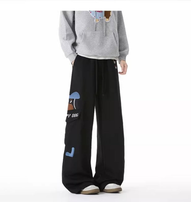 - Pantalons de survêtement amples à poches multiples avec broderie de chien pour un style de rue ludique et vintage.