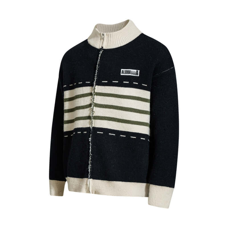 • Color-Block Knit Stand Collar Cardigan in black and cream with green stripes and stand-up collar