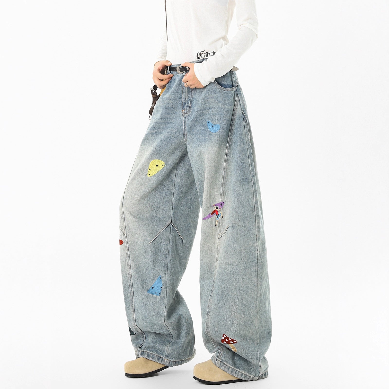 Style: Hong Kong StylePattern Type: EmbroideryFit Type: Loose FitLength: Long PantsWaistline: Mid-riseClosure Type: Button FlyFabric: DenimMaterial: CottonElasticity: Slightly StretchyDetails: Topstitching,...