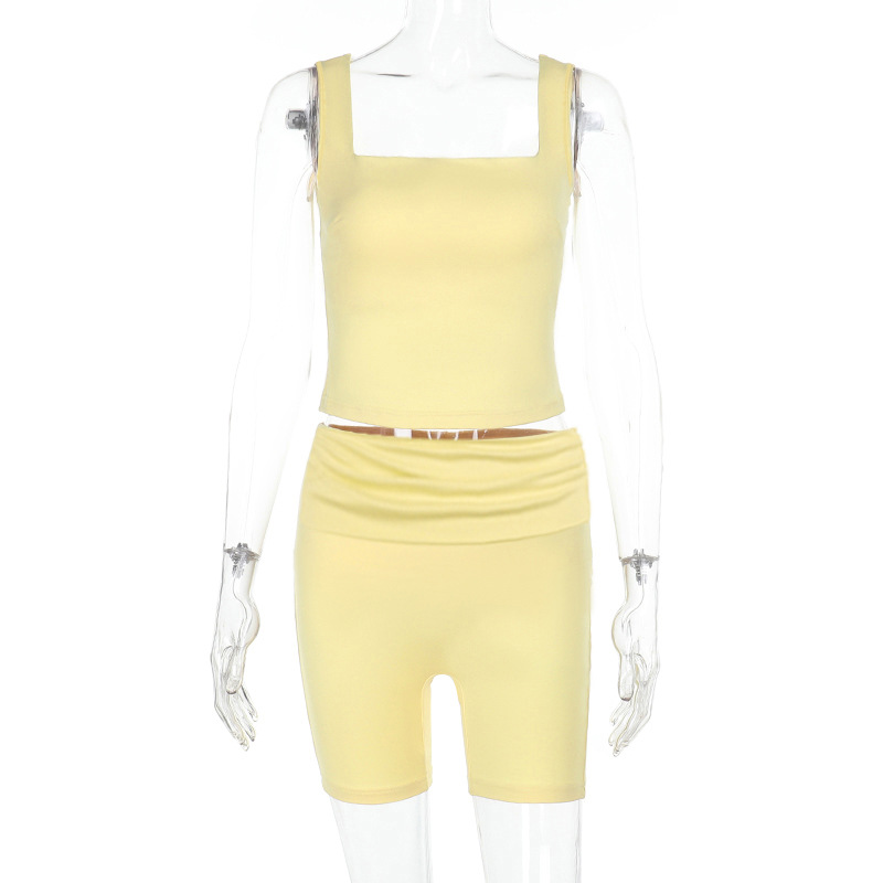 • Square Collar Pleated Two-Piece Set in light yellow featuring a square neck top and matching shorts.