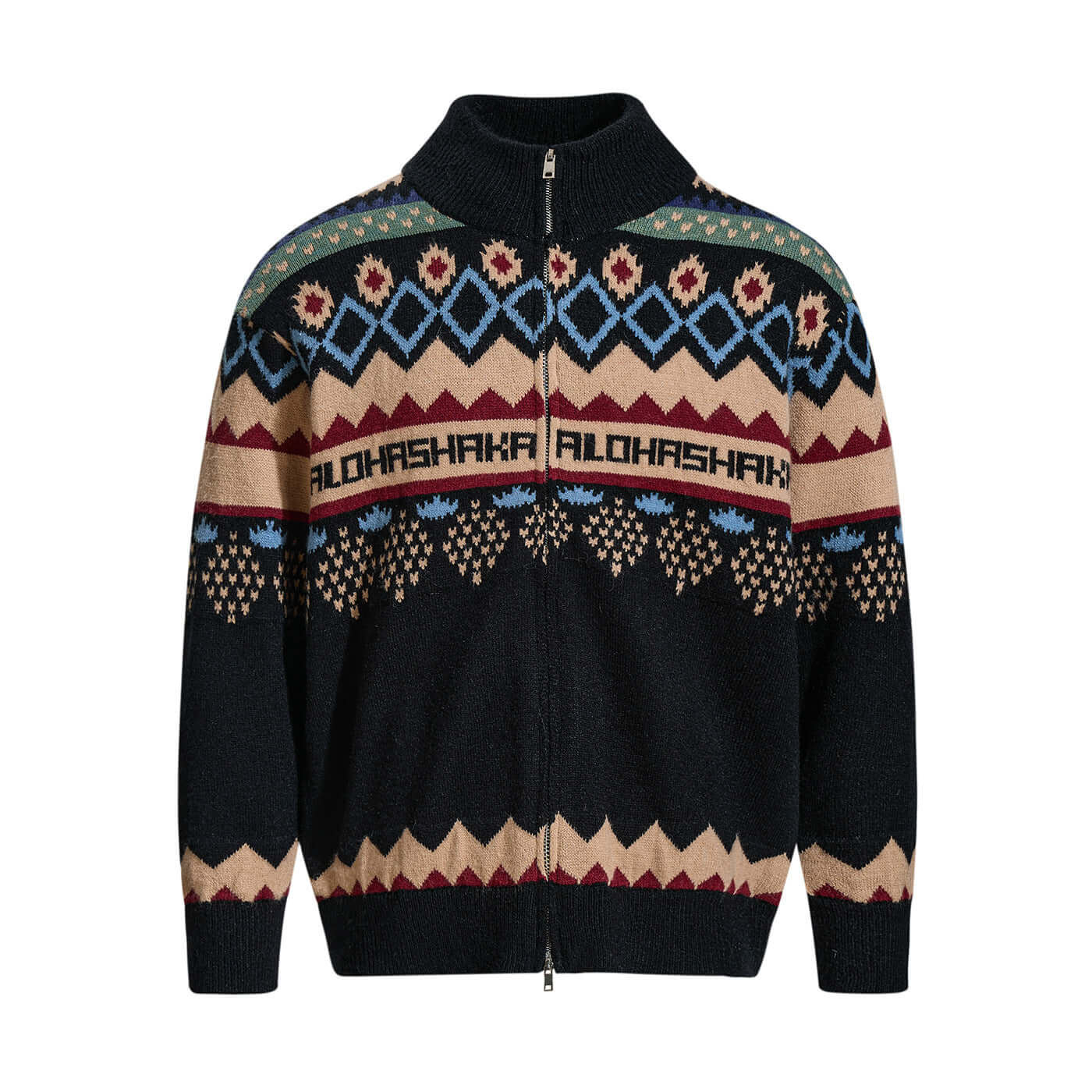 • Jacquard Knit Pullover Sweater showcasing a stylish zippered design with vibrant geometric patterns.