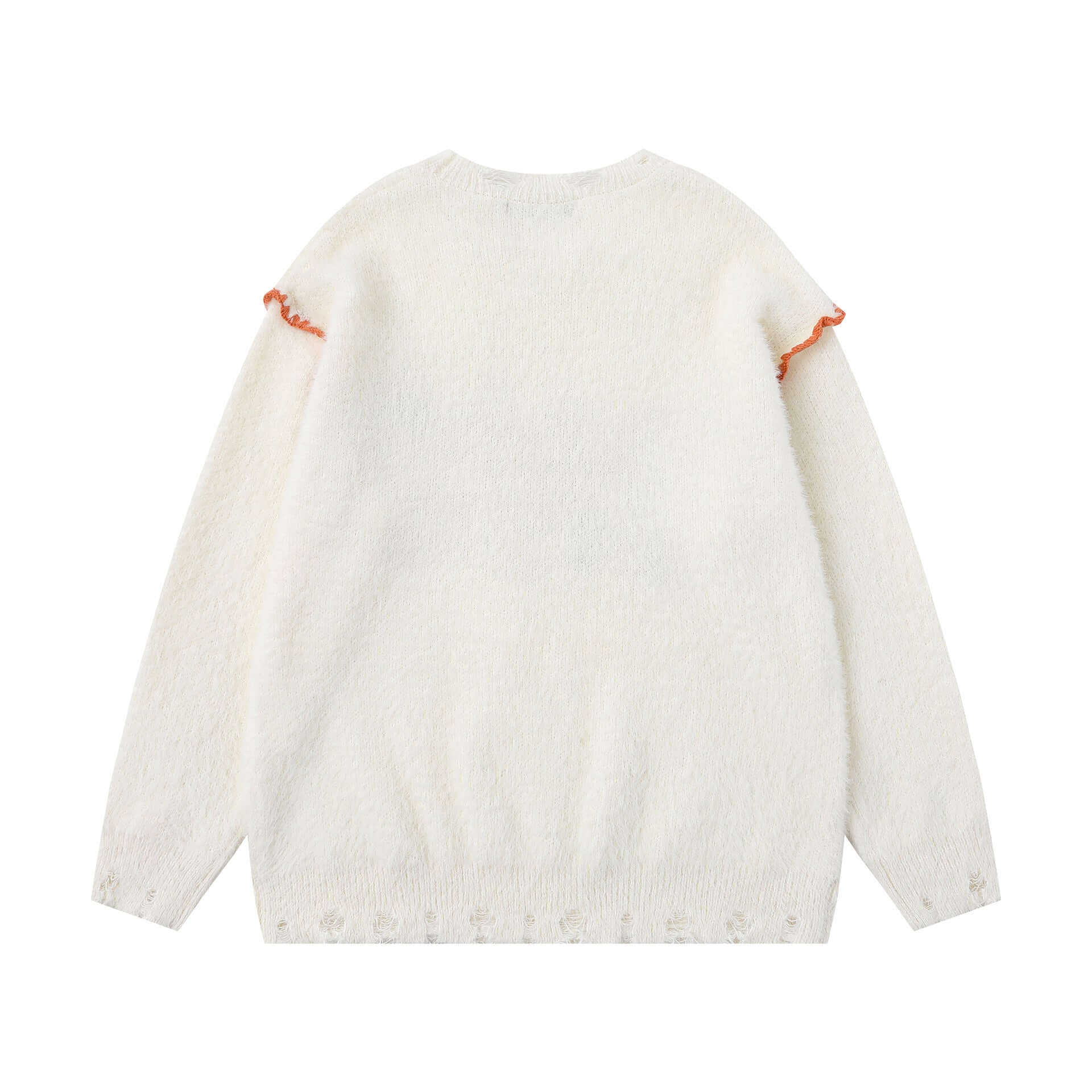 • Knit Sweater with Letter Applique, back view showing soft white fabric and orange ruffle detailing.