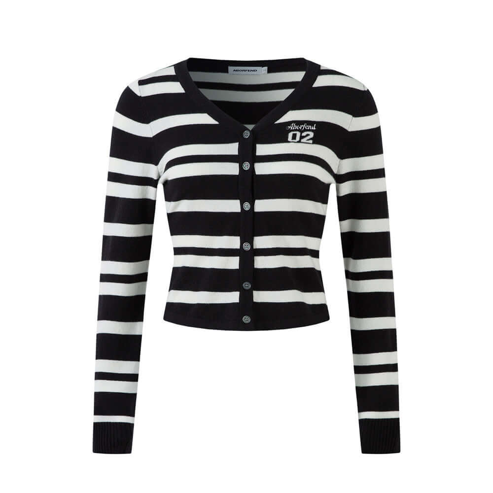 • Striped VNeck Knit Cardigan – Slim Fit featuring a black and white striped design and embroidered details.