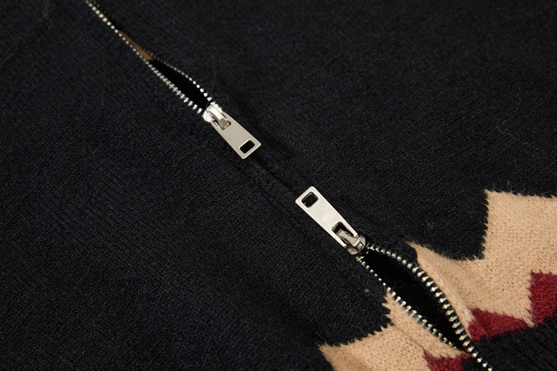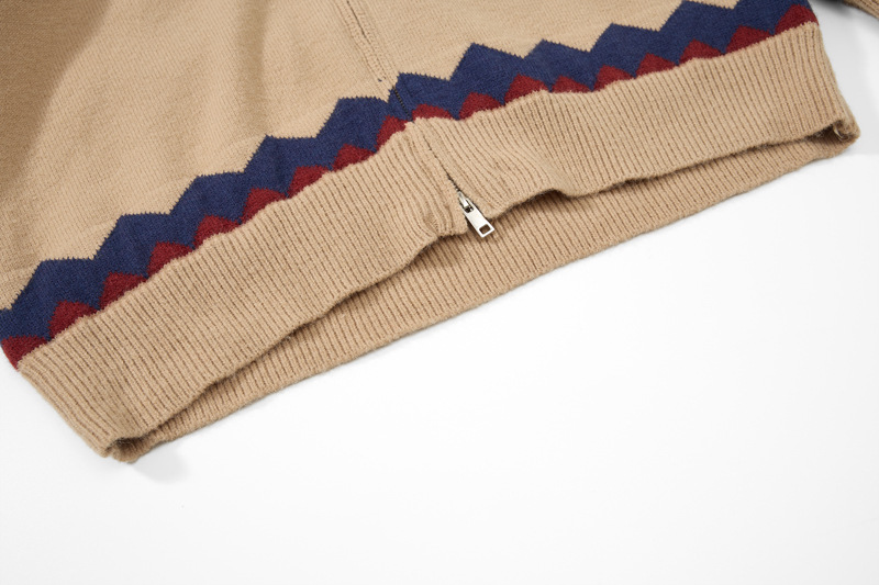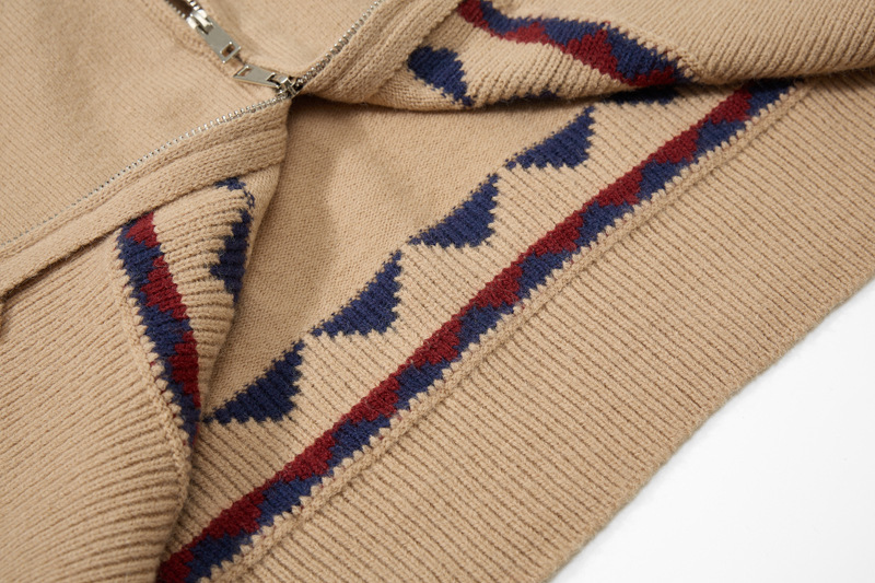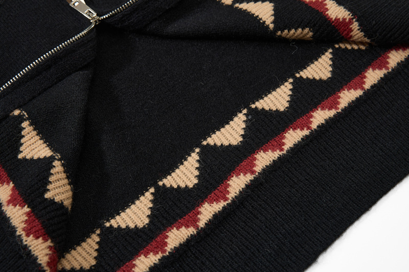 - Cardigan jacquard a maglia color block, morbido e dal taglio ampio, con colletto alto per uno streetwear unisex elegante e confortevole.