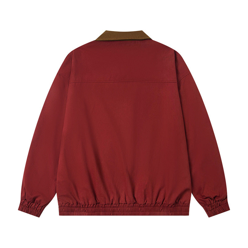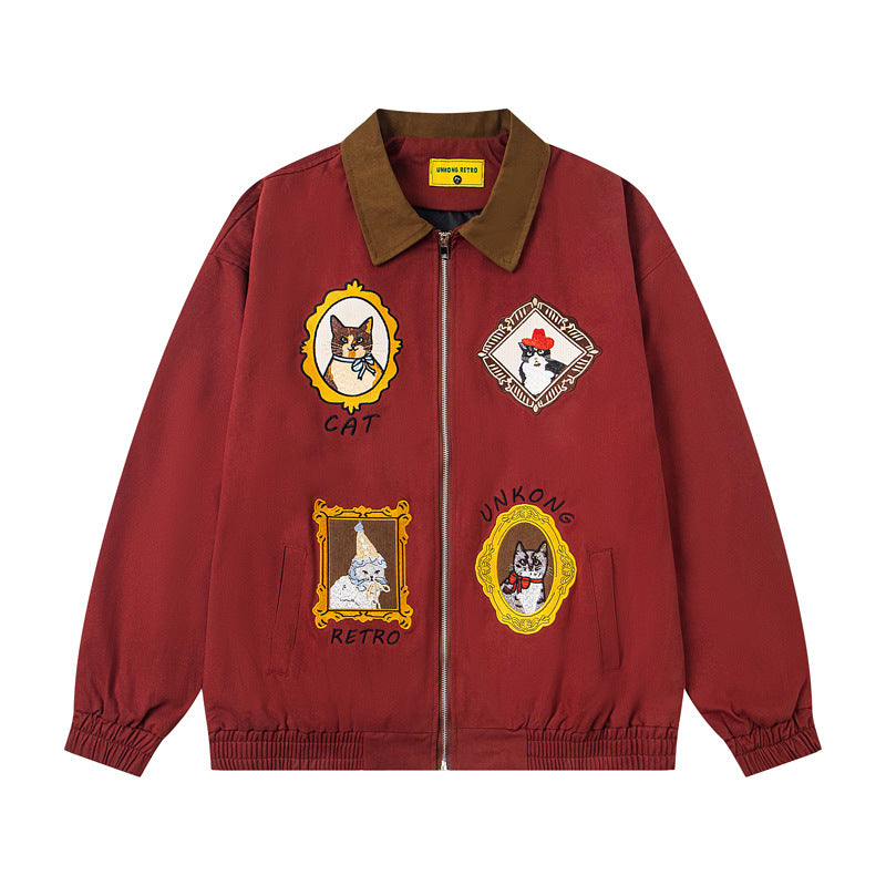 Street Trend Style, Chinoiserie Vintage Cat Embroidery, Patchwork Splicing Detail, Long Sleeves, Flip Collar, Full Zipper Closure, Outerwear Wearing Style, Straight Hem Waistline, Side Seam Pockets, Unisex Fit, Colors: Red/Apricot