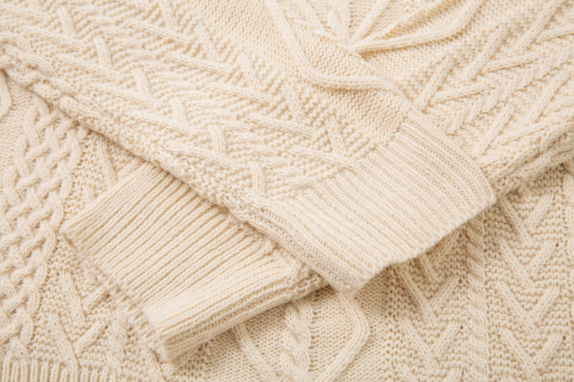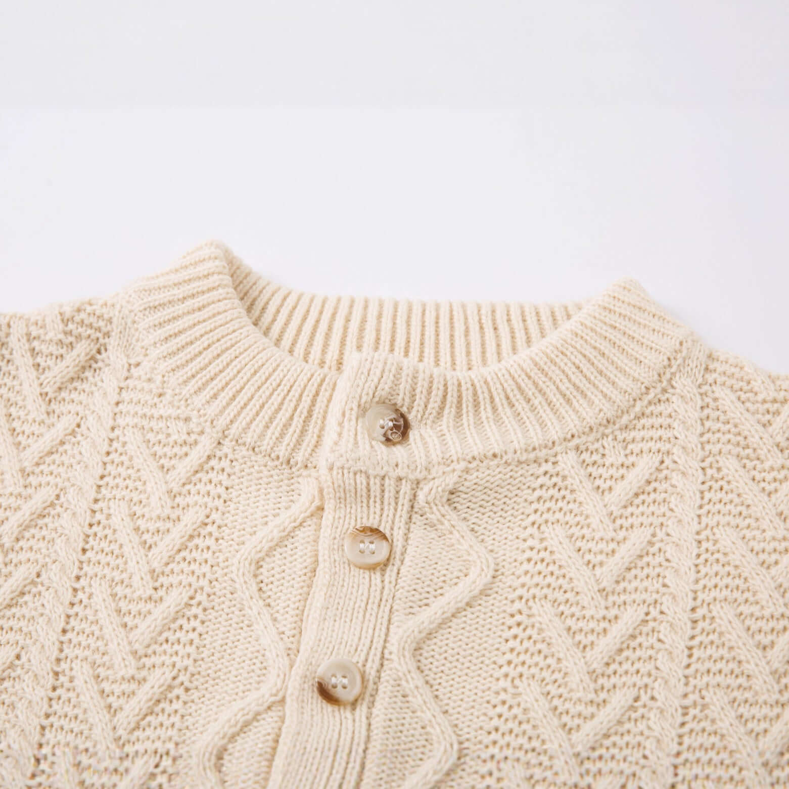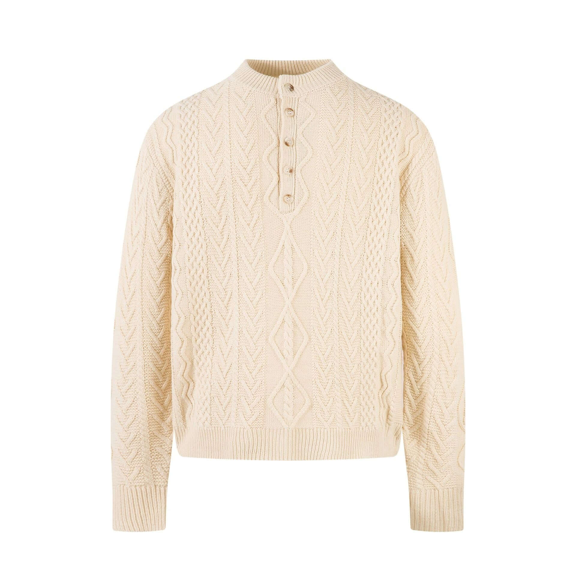 • Diamond Pattern Jacquard Knit Sweater in cream color with a half-open collar and button detail.