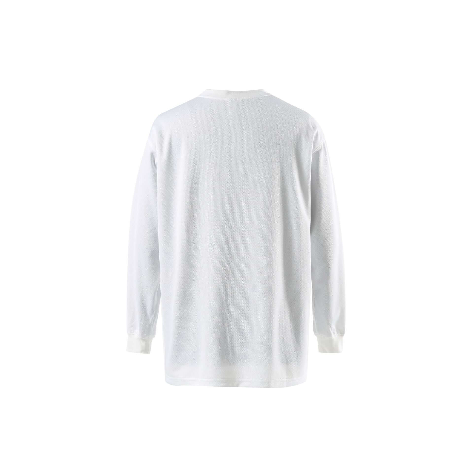 The letter digital print combined with collage/splicing details adds modern street appeal, while the round neckline and collarless pullover design keep it clean and versatile. Available in classic white and black, this long-sleeve jersey T-shirt is an effortless staple for relaxed, trend-forward outfits.