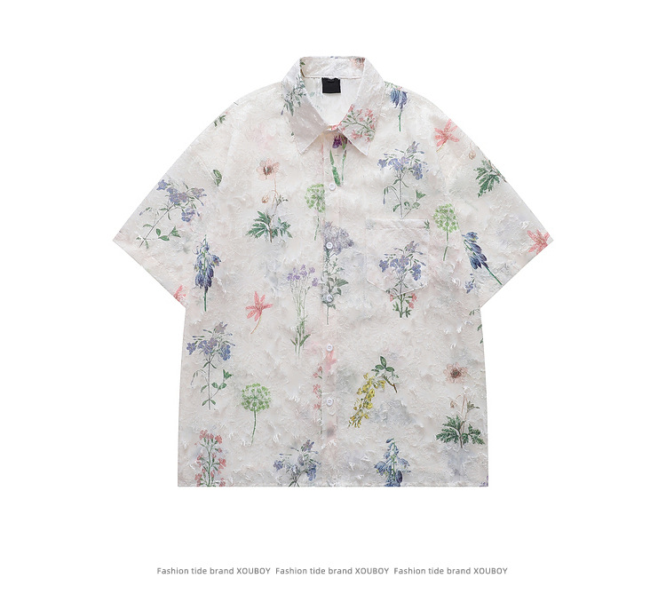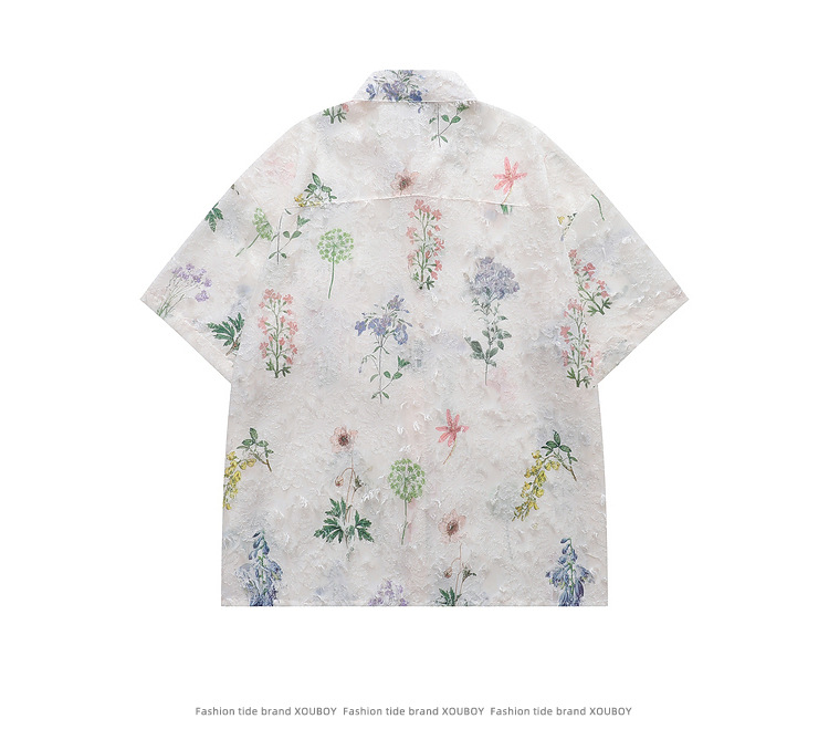 Wrinkle-free high colorfastness polyester floral shirt with loose fit and short sleeves for youthful summer streetwear comfort.