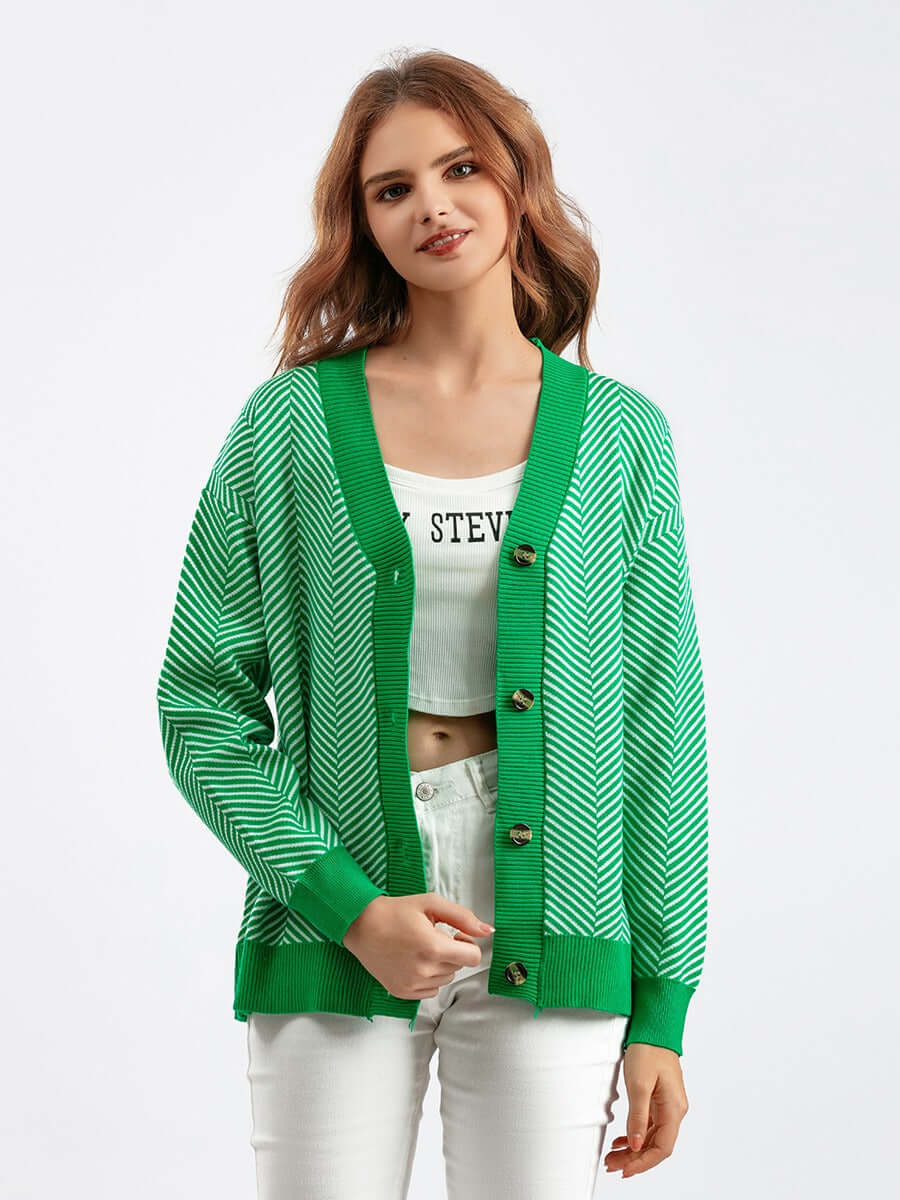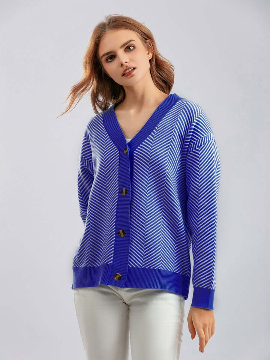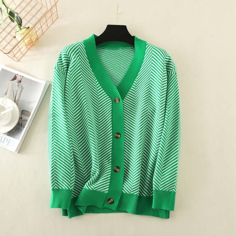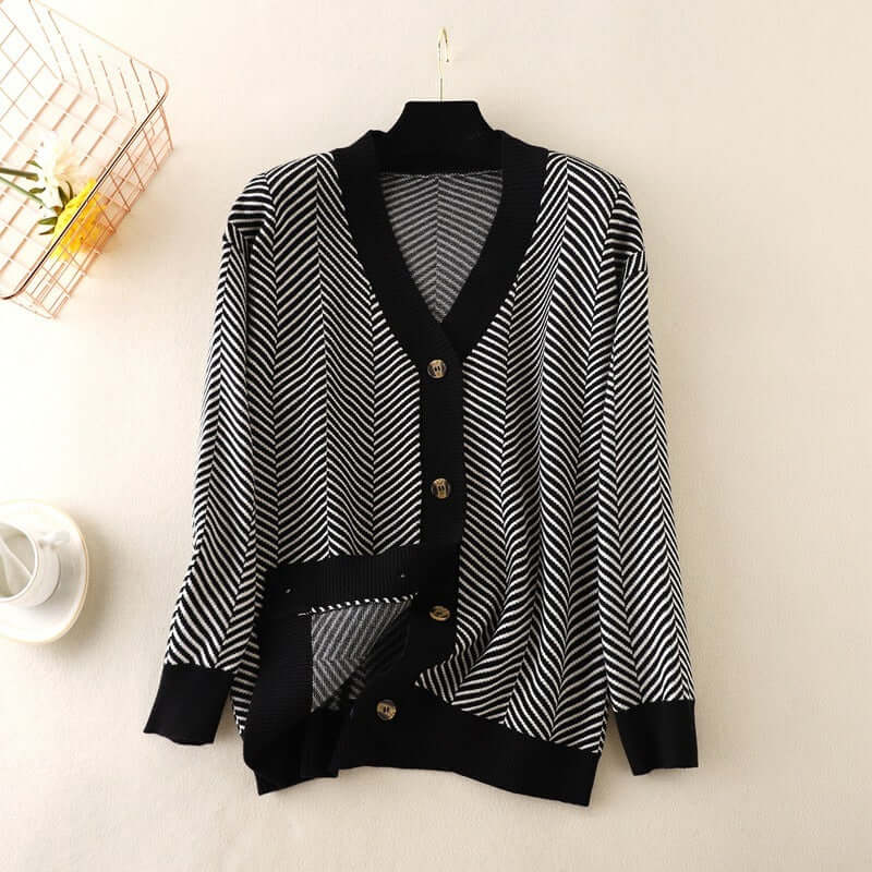 - Soft moderate-thickness V-neck heart stripe knit cardigan for warm, stylish, and comfortable women’s spring-autumn streetwear.