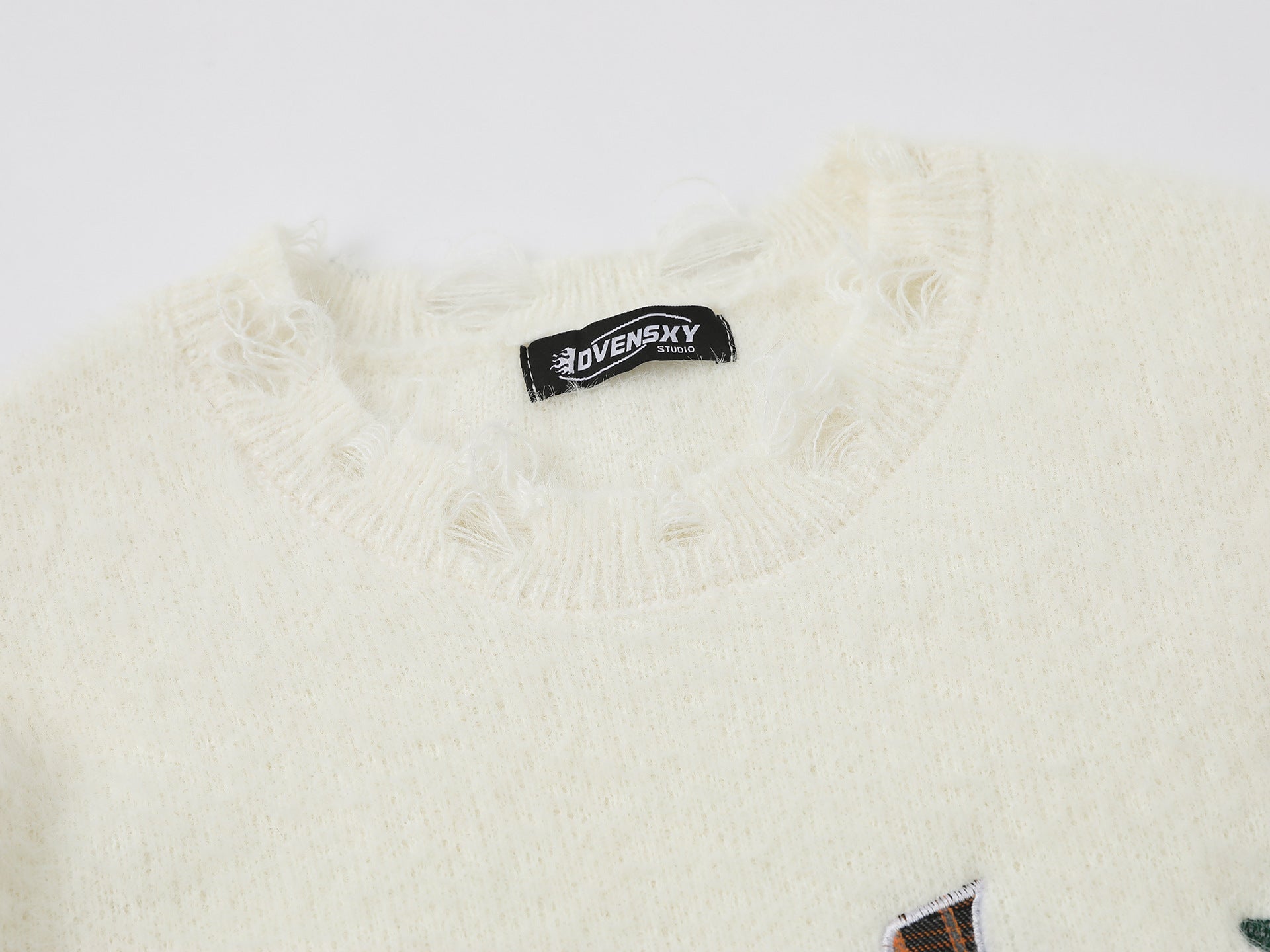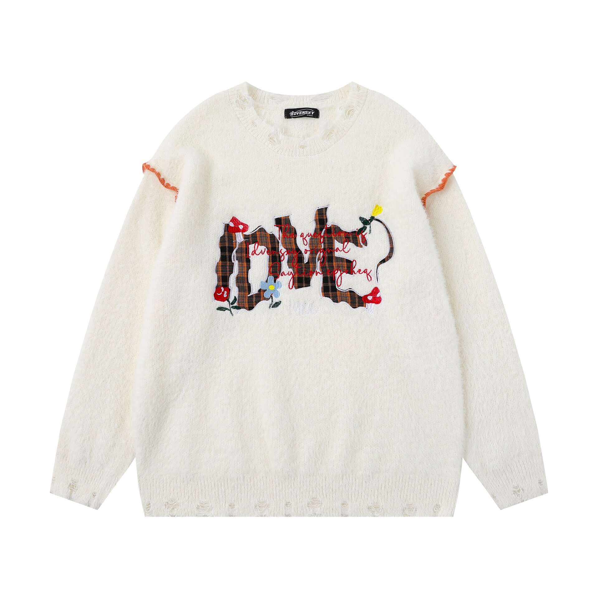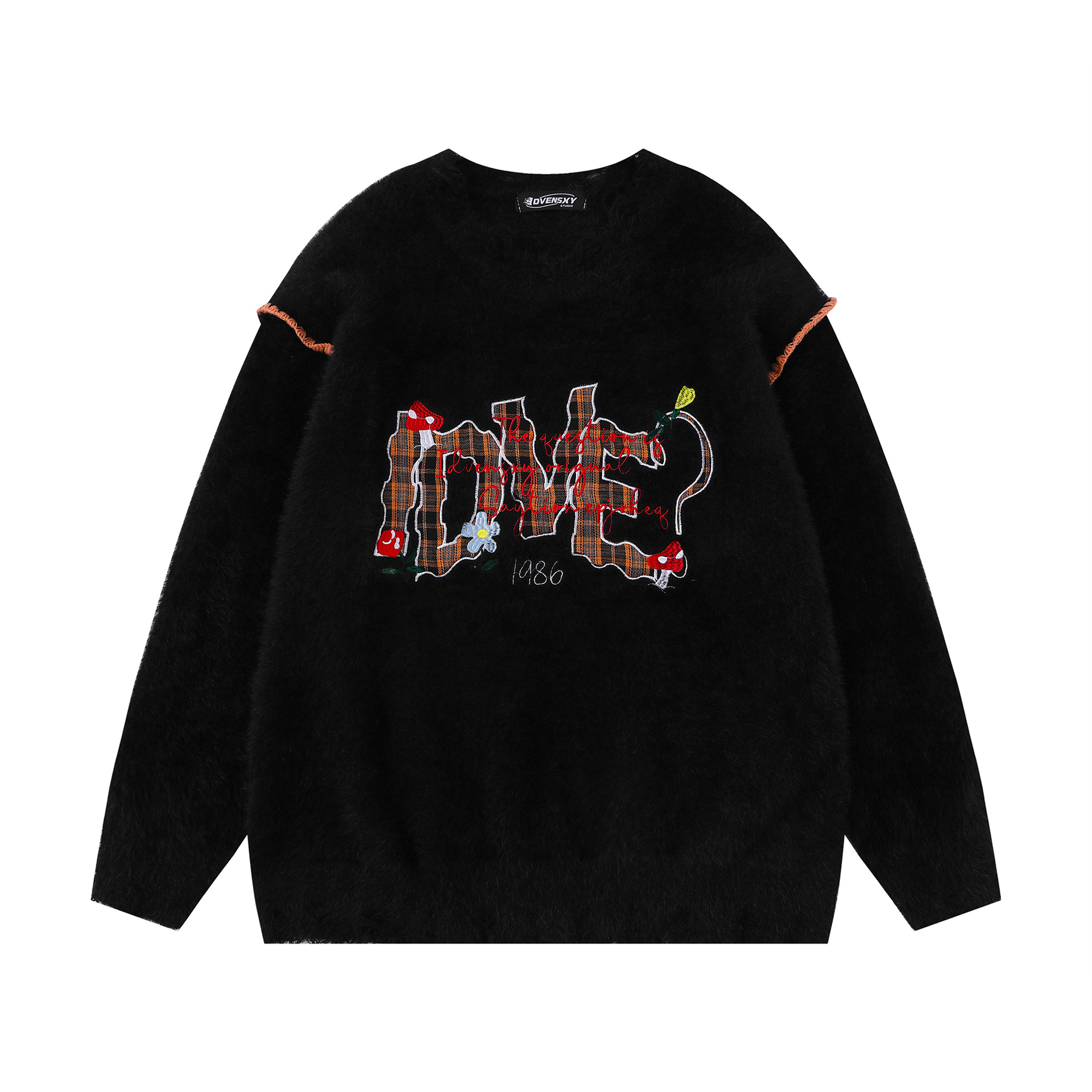 - Warm loose-fit nylon knit sweater with hand-stitched letter applique for bold, comfortable, and stylish daily streetwear.