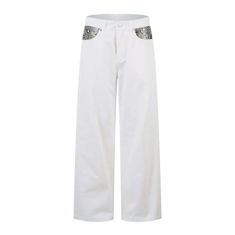 • Patchwork Straight Jeans – Loose Fit with snake pattern accents on pockets, showcasing a modern streetwear style.
