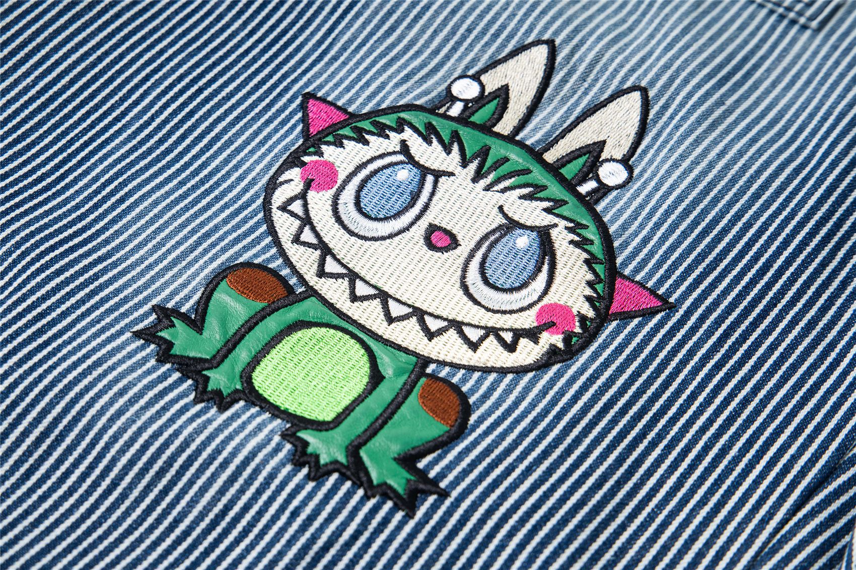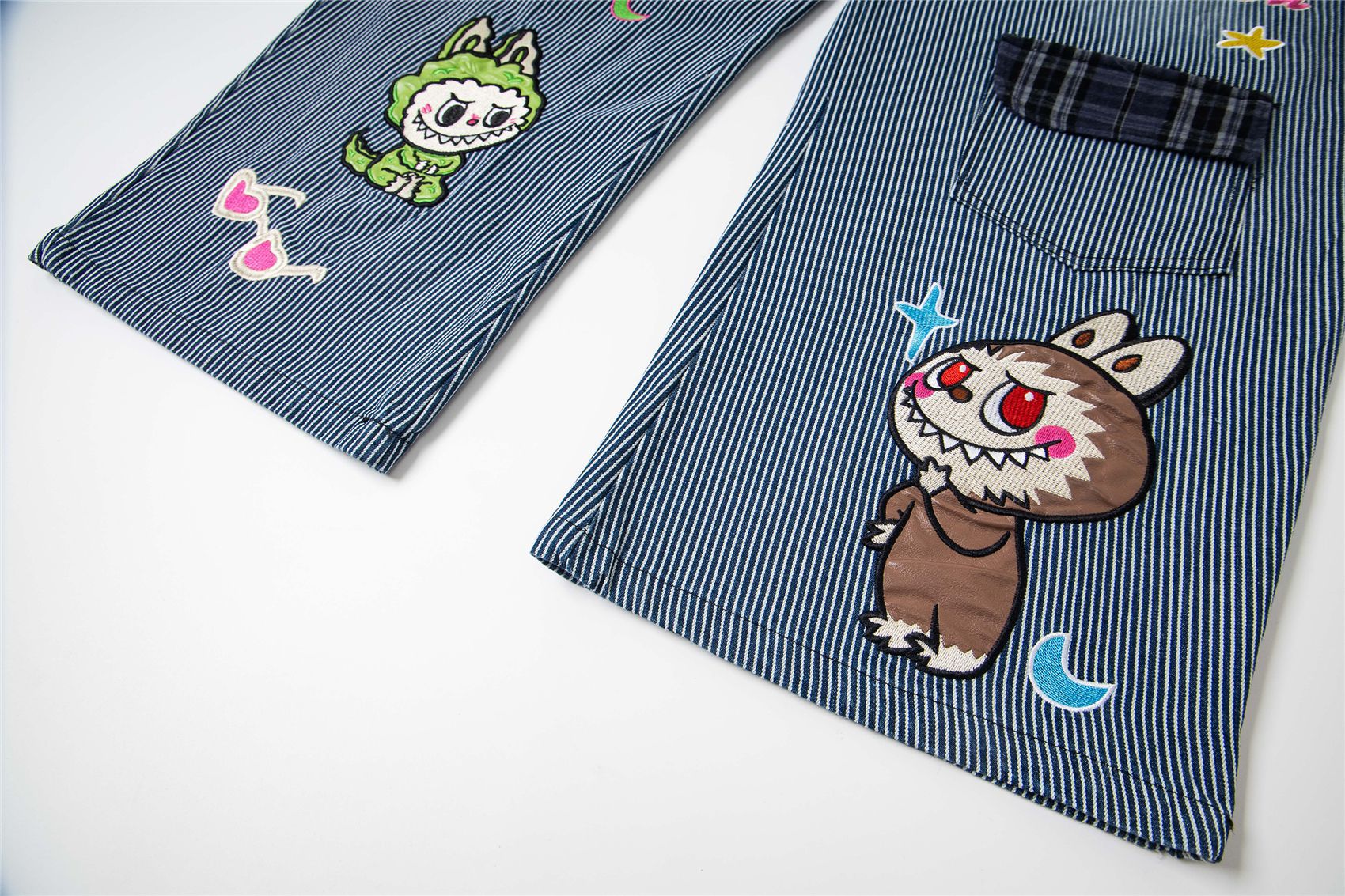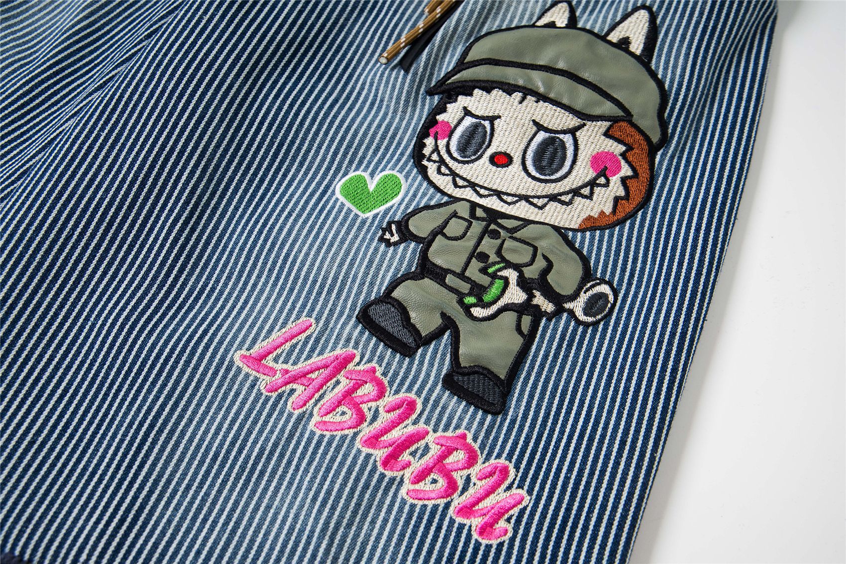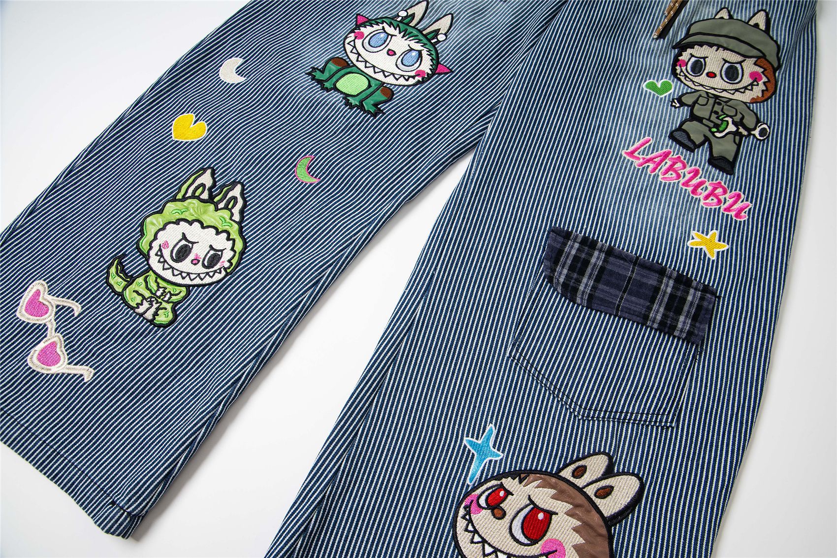 Retro Fun Cartoon Embroidery Washed Stripe Denim Pants Unisex Loose Casual Straight Street Long Trousers