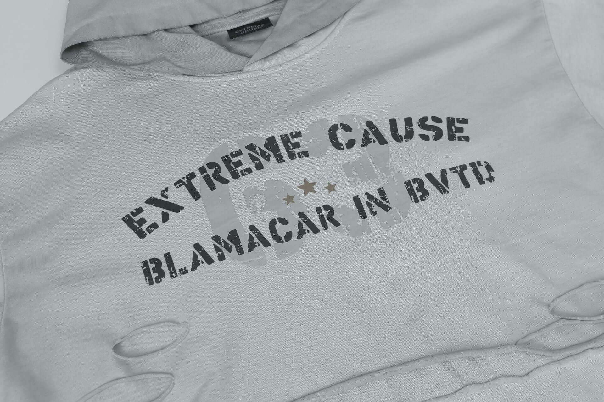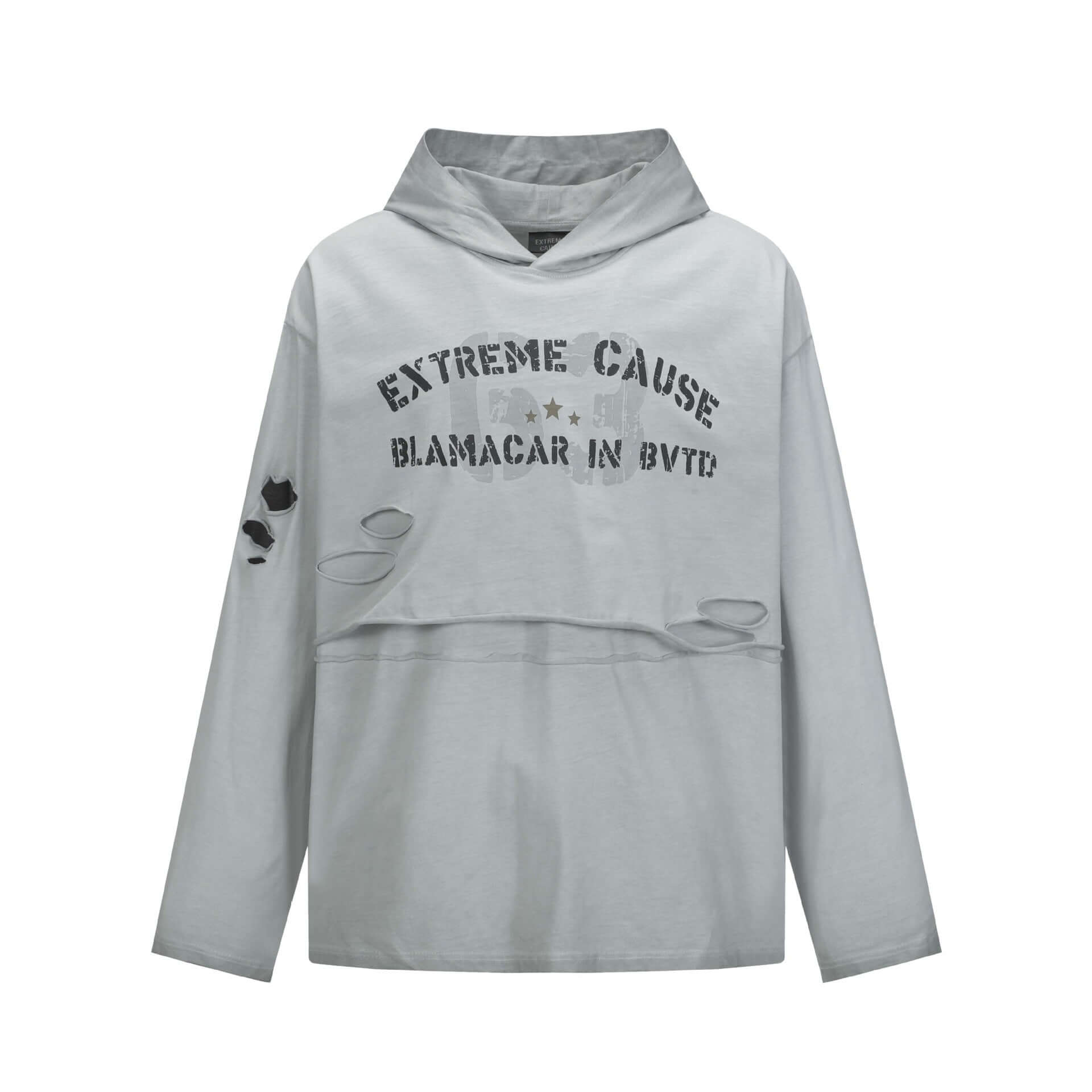 • Retro Letter Print Hoodie – Loose Fit in light gray with distressed details and urban letter print.