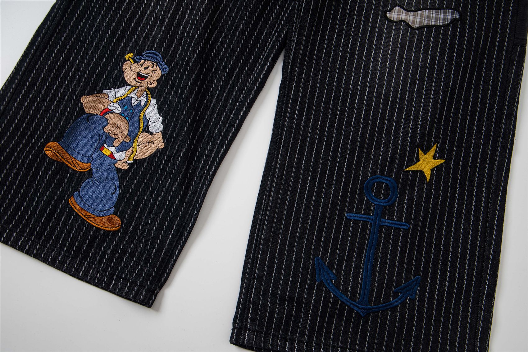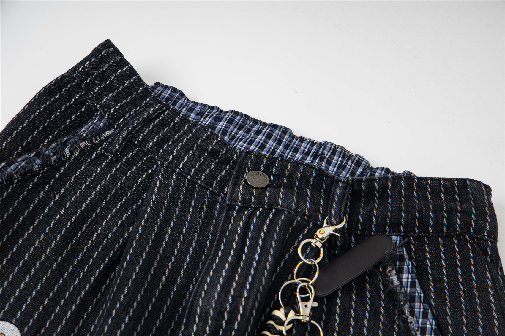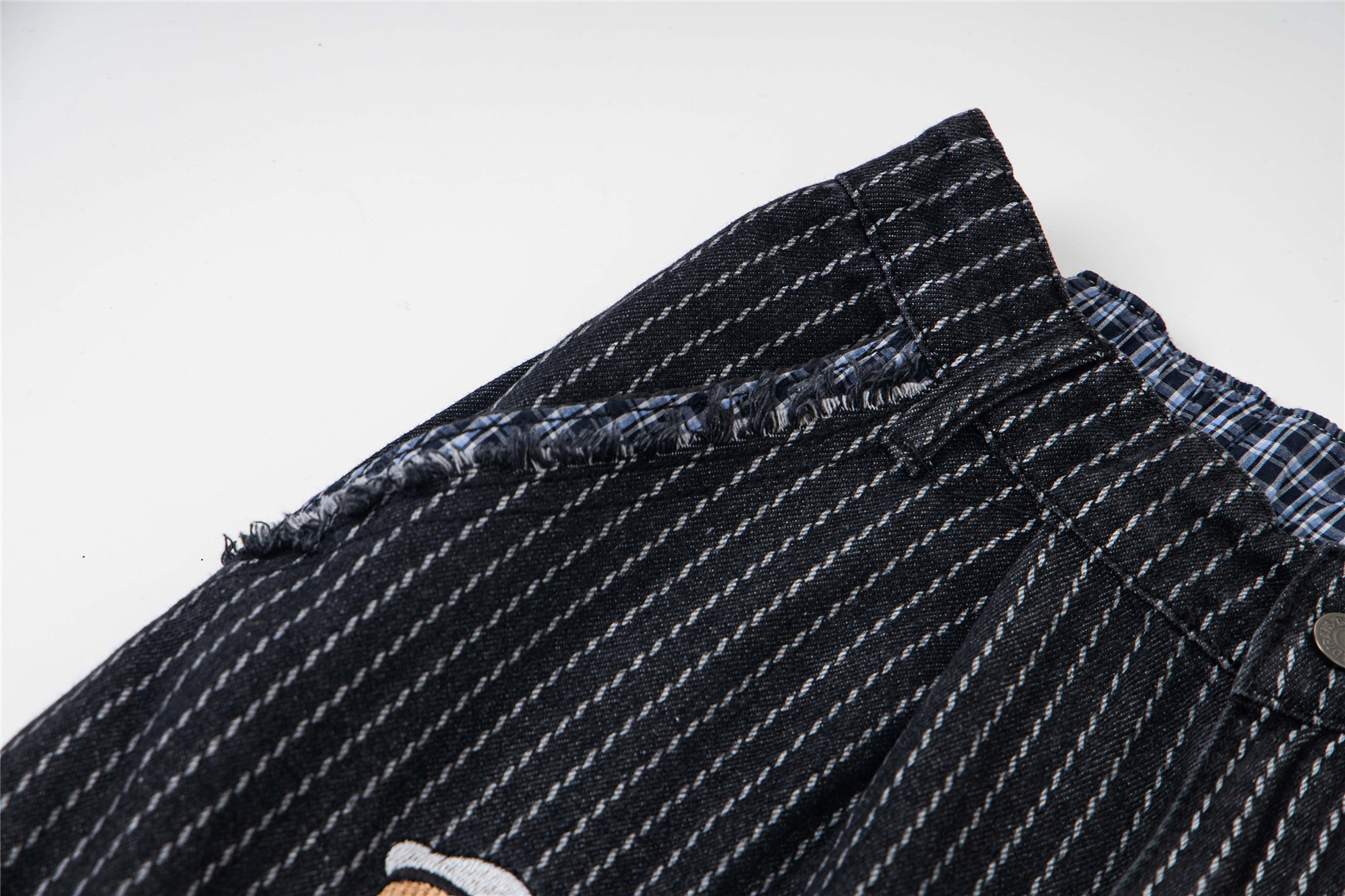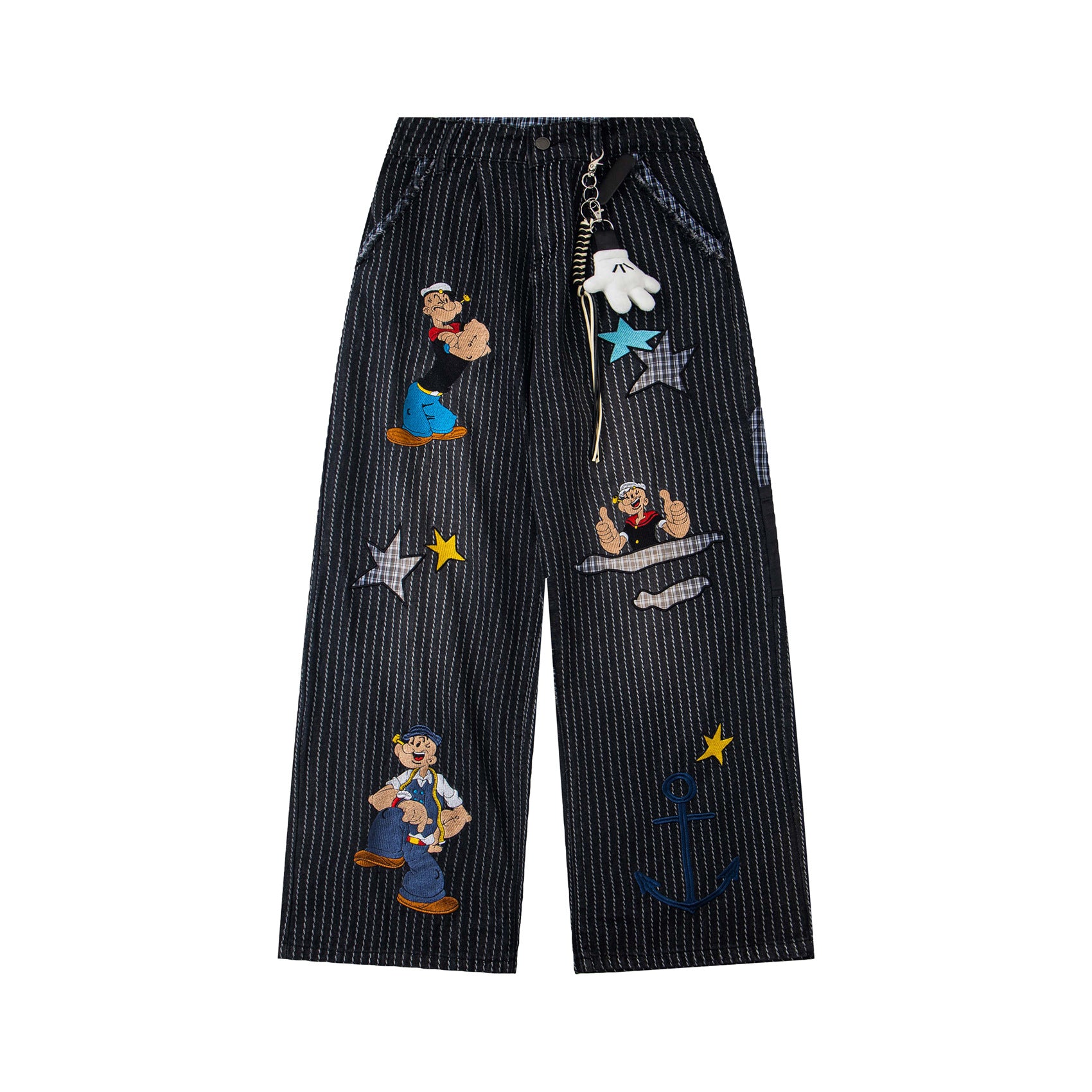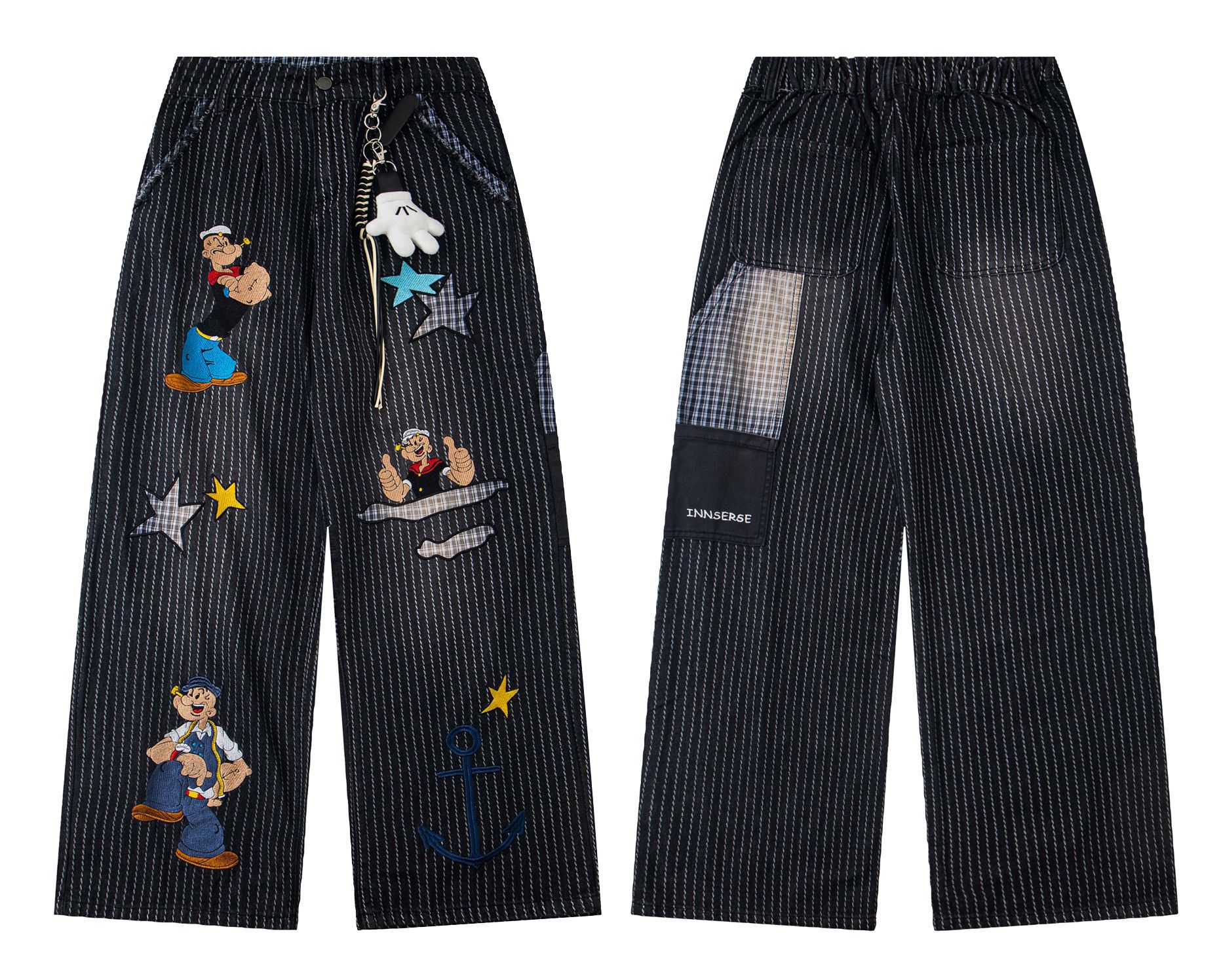 Retro Washed Fun Pattern Embroidery Splicing Striped Loose Casual Trousers Unisex BF Wide Leg Pants
