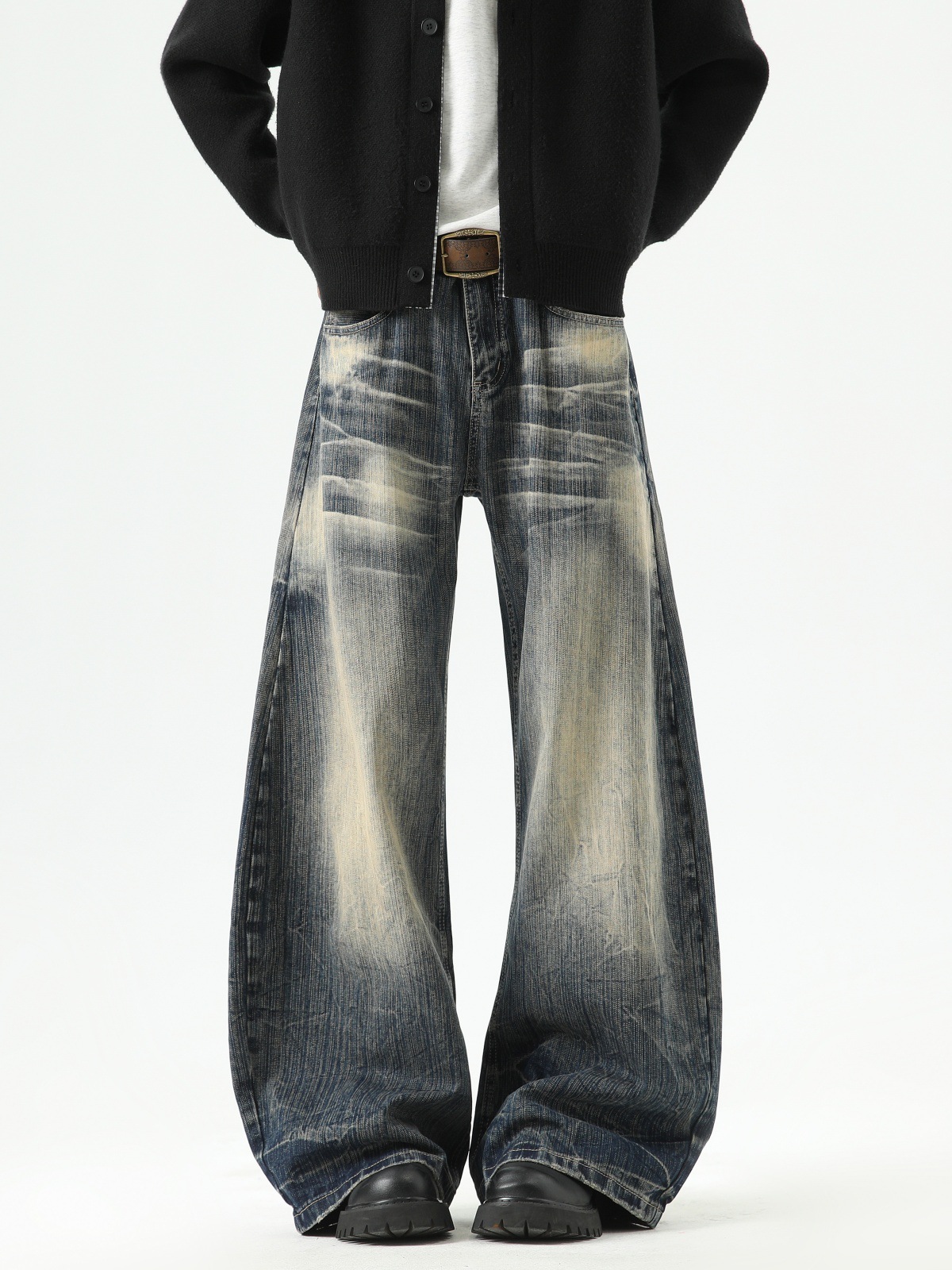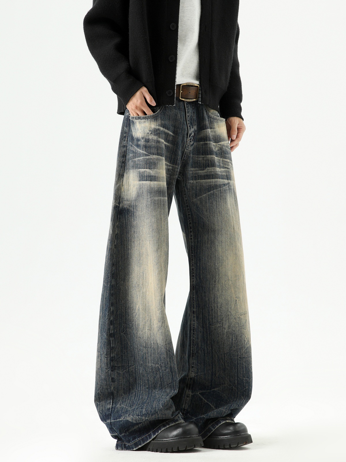 Streetwear Lightning Pattern Denim Pants Men High Street Washed Distressed Wide Leg Pants Vintage Cool Retro Knife-Edged Casual Trousers