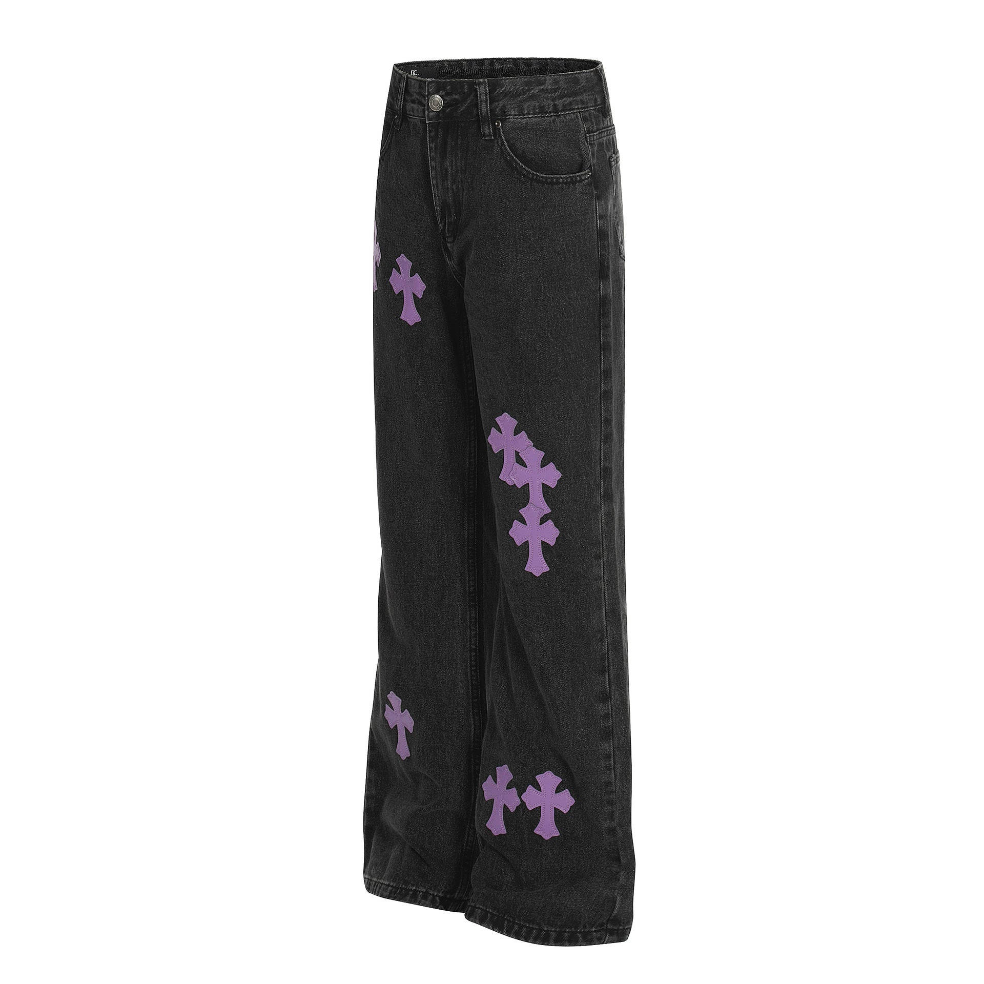 Retro Cross Pattern Applique, Basic Style Design, Slim Fit with Flared Hem, Full Length Cut, Mid Waist Fit, Button Fly Closure, Topstitching Detail, Street Fashion Unisex Denim Pants