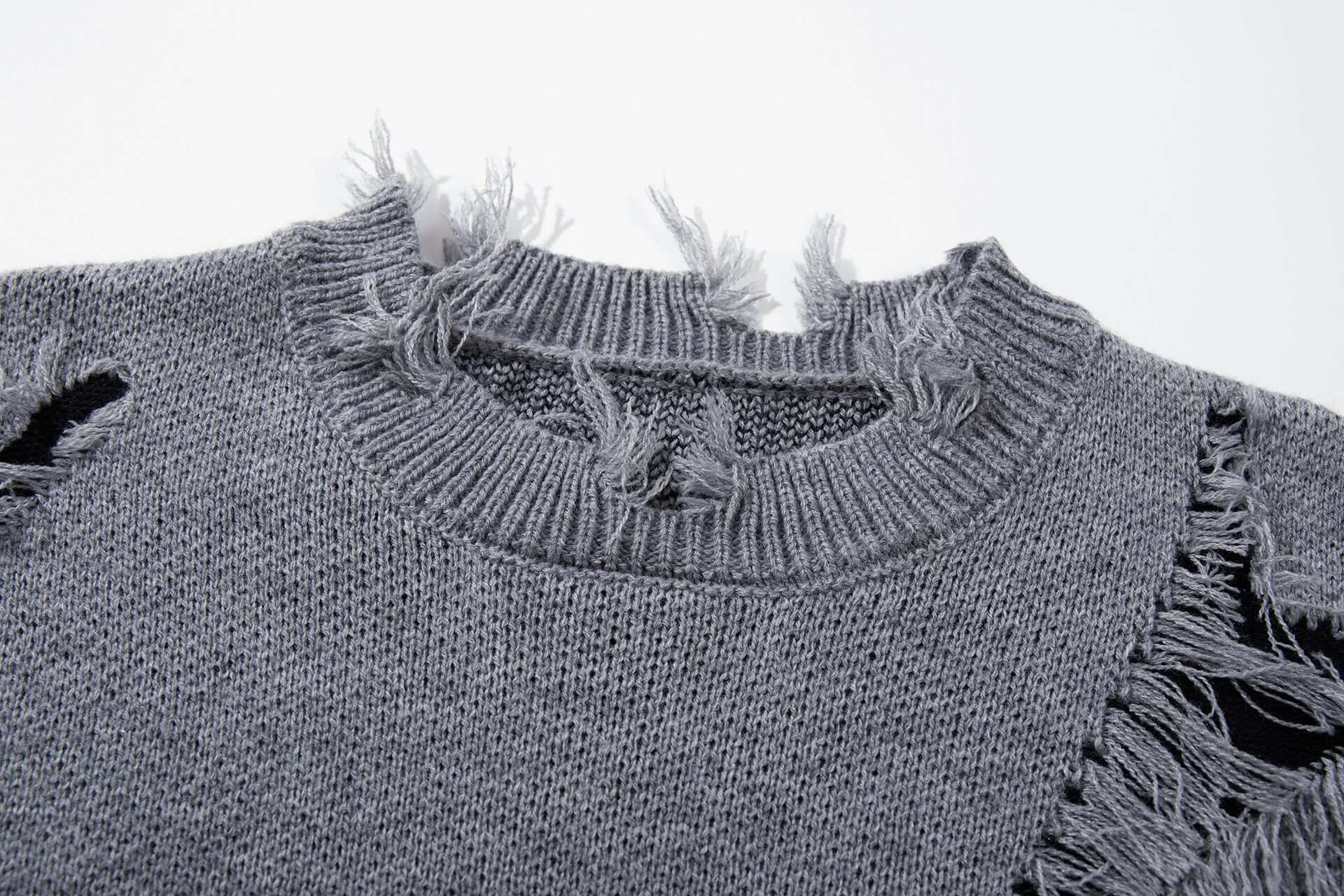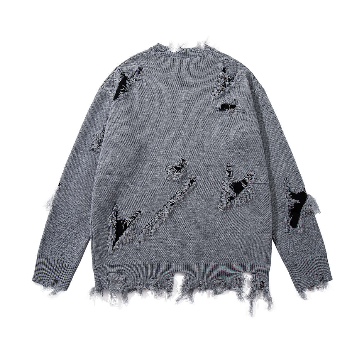 • Tassel Distressed Knit Sweater – Loose Fit featuring unique distressed design and tassel details in gray.