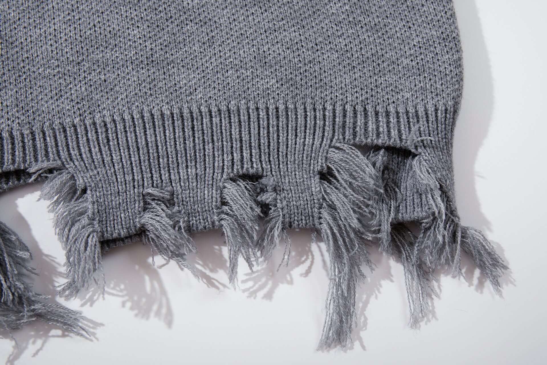 • Tassel Distressed Knit Sweater – Loose Fit showing rugged distressed texture and tassel details.