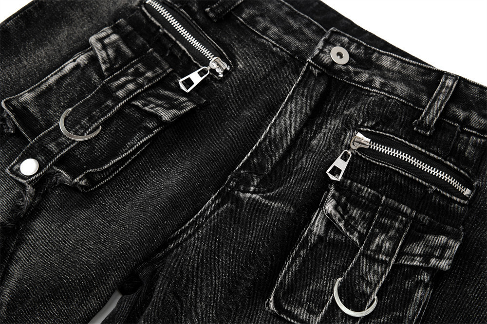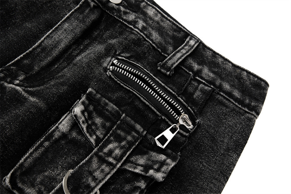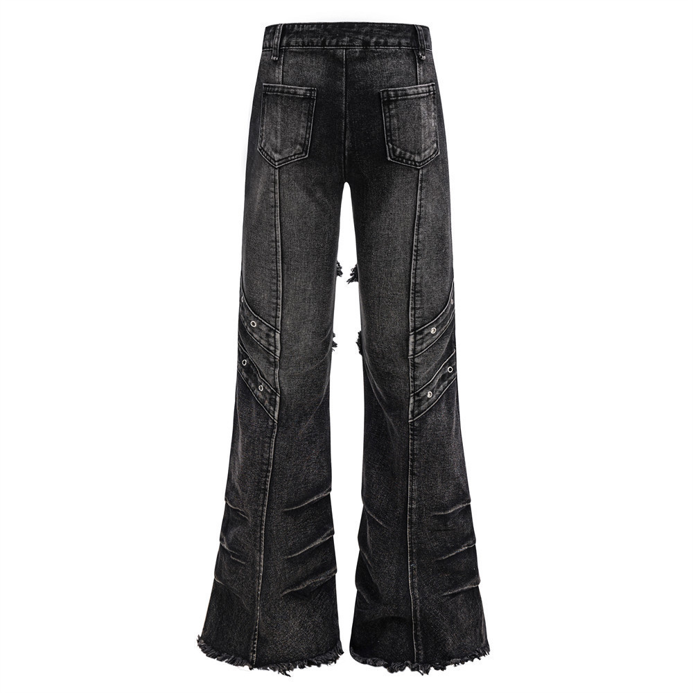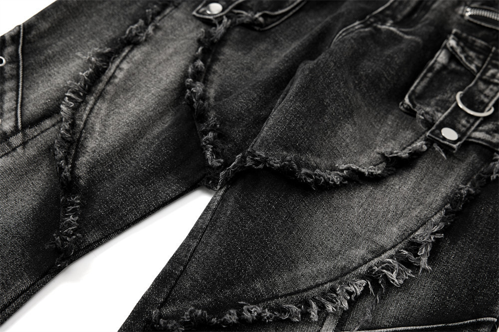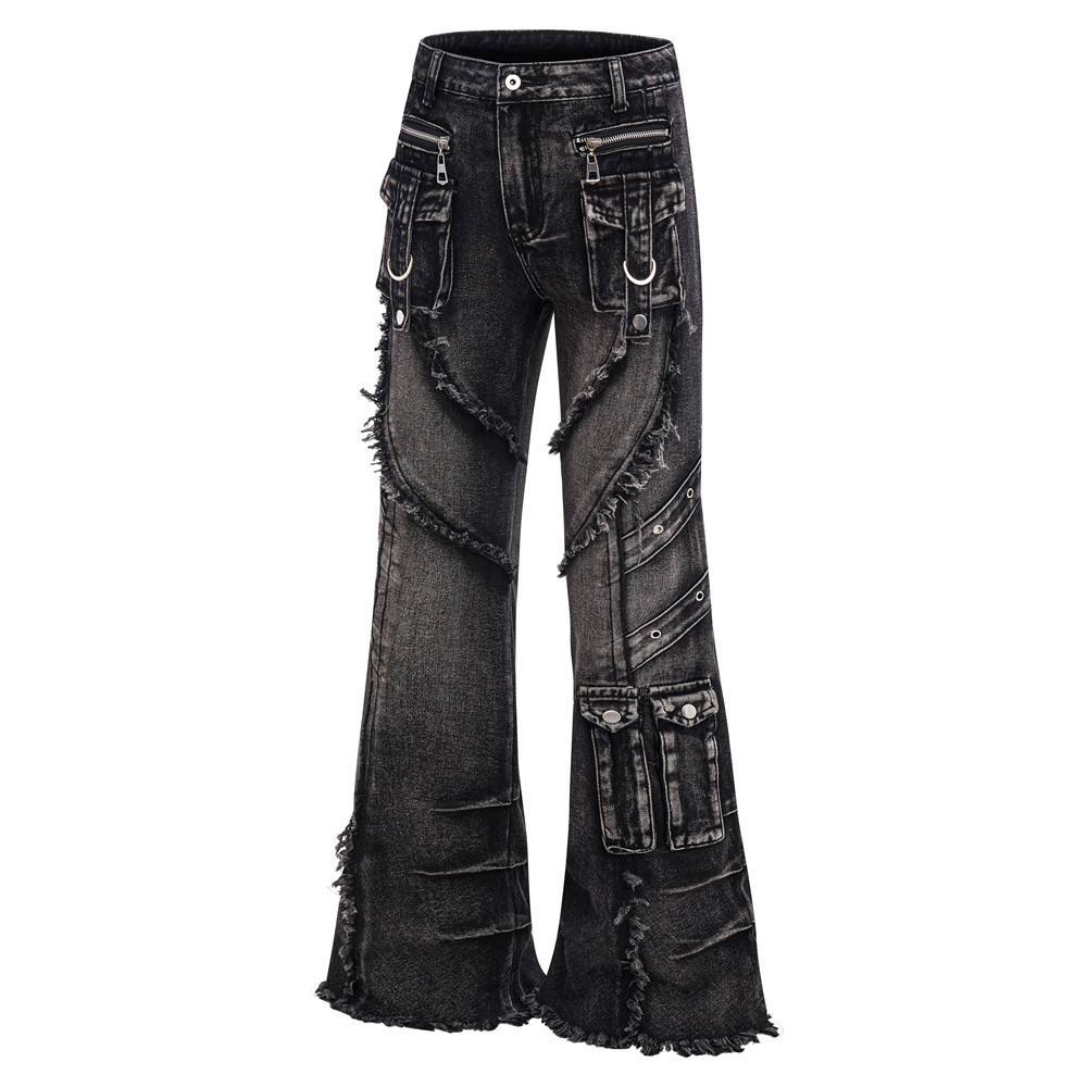 Trendy Belted Flared Cargo Jeans Men Heavyweight Distressed Raw Hem Deconstructed Patchwork Unique Personality Long Pants