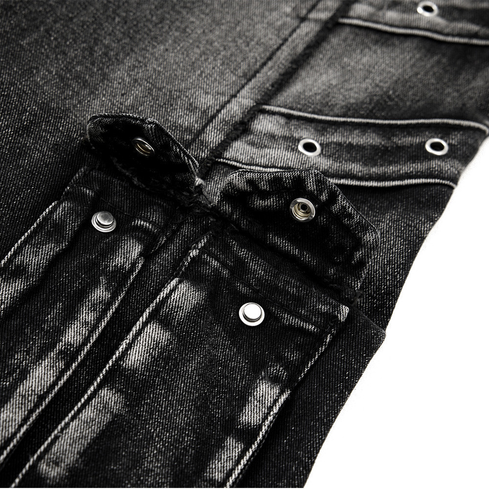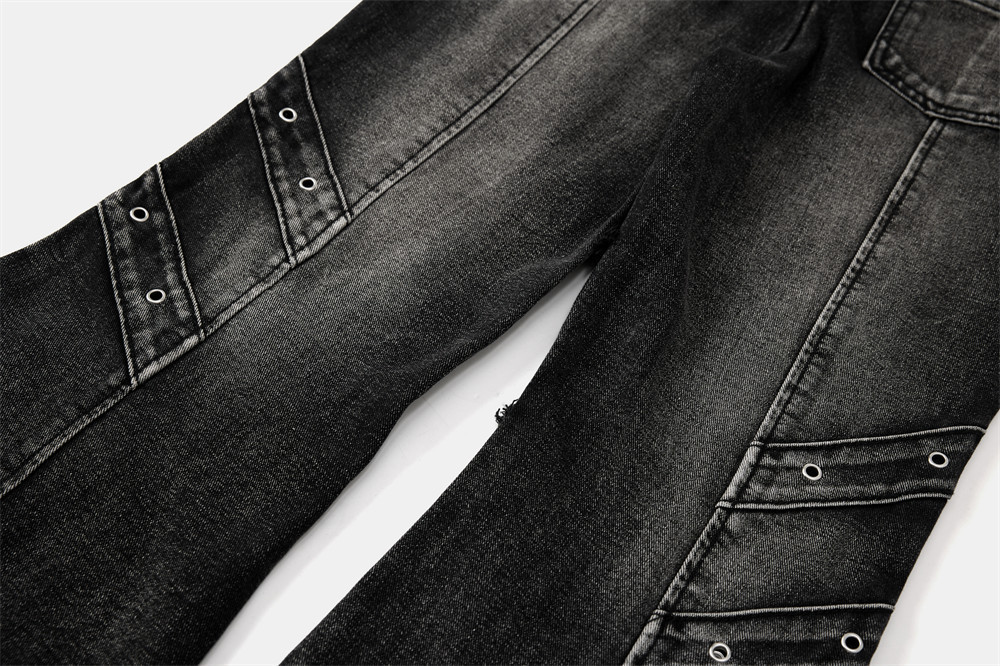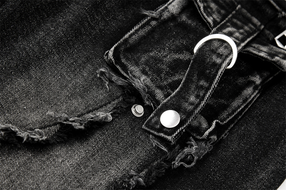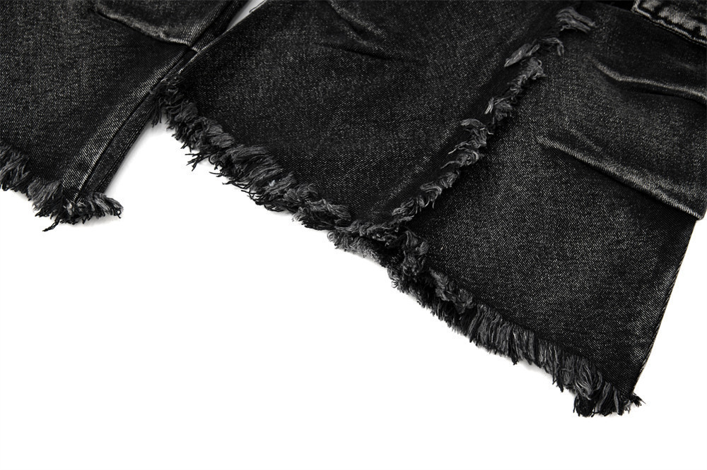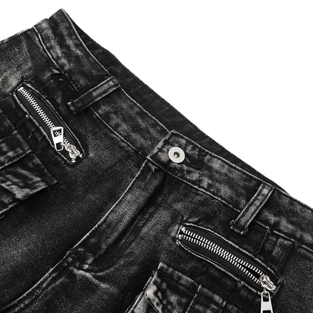 Trendy Belted Flared Cargo Jeans Men Heavyweight Distressed Raw Hem Deconstructed Patchwork Unique Personality Long Pants