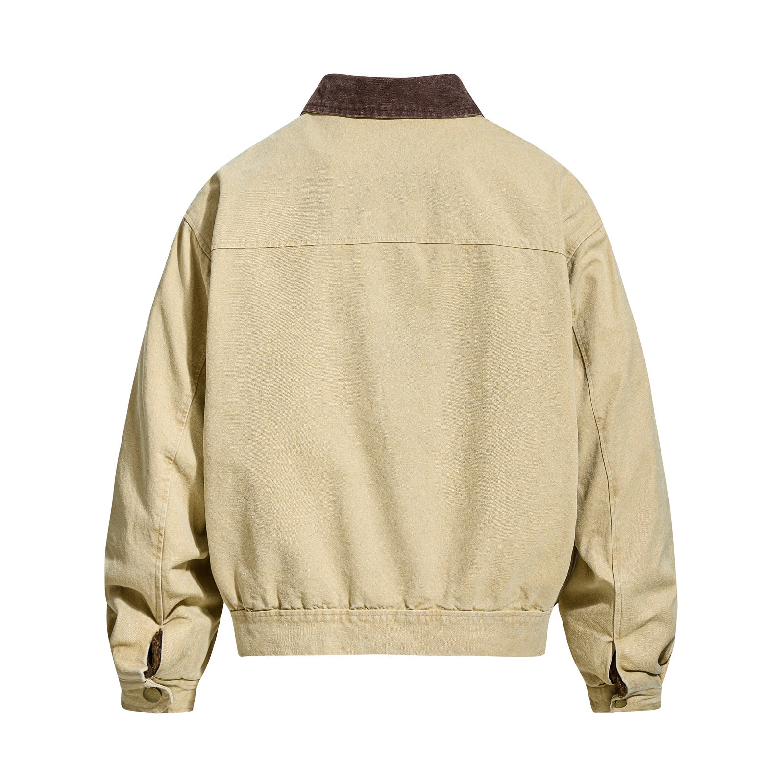American Vintage Style, Cartoon Pattern, Portrait Letter Print Design, Printing Detail, Patchwork Splicing, Long Sleeves, Flip (Turn-down) Collar Neckline, Full Zipper Closure, Loose Fit, No Hood, Straight Hem Waistline, Side Seam Pockets, Regular Sleeve Style, Outerwear Wearing Style, High Color Fastness Feature, Autumn Season Wear, Khaki Color