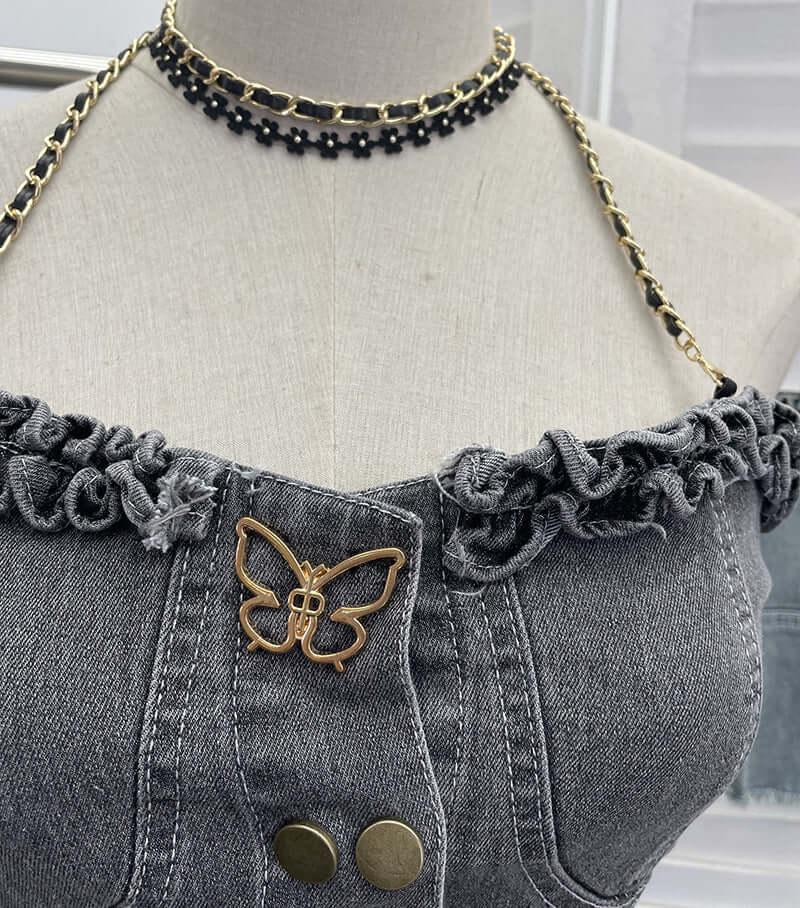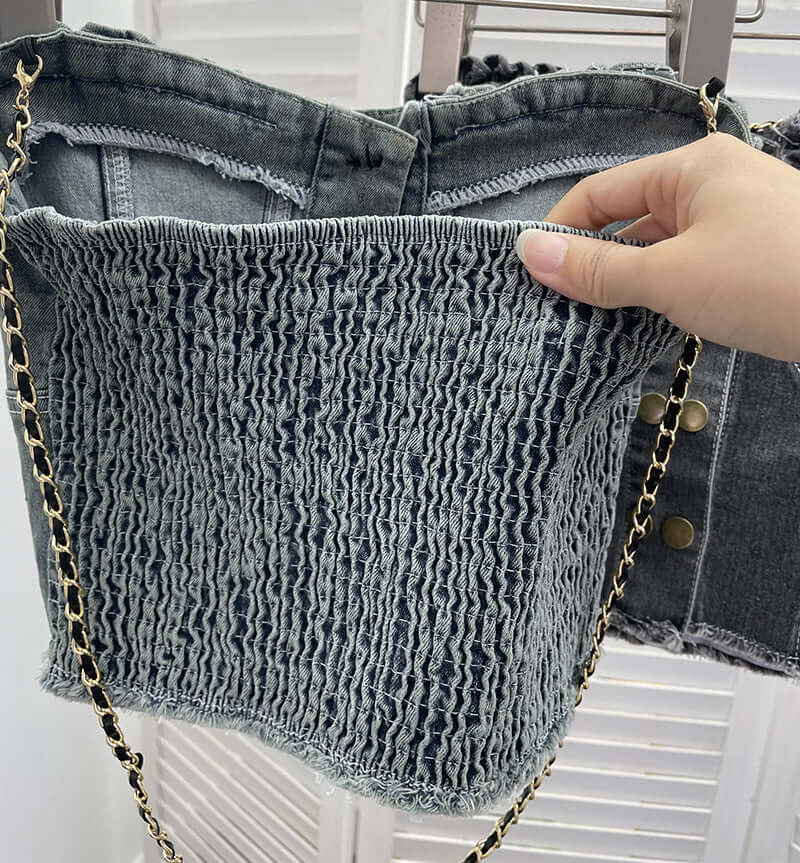 Atrage privirile cu topul fără bretele Cowboy Denim Buckle, conceput pentru femeile care iubesc o estetică îndrăzneață, dulce și picantă. Acest articol deosebit are un aspect structurat din denim, detalii elegante cu cataramă și o siluetă fără bretele cu bretele detașabile, permițându-ți să alternezi între stiluri edgy și clasice.