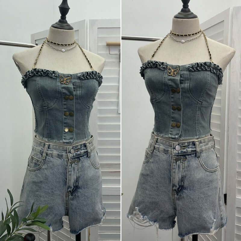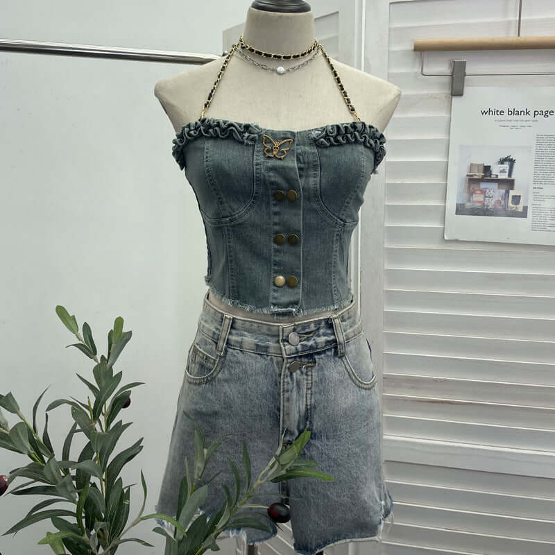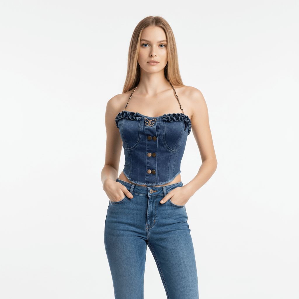 Atrage privirile cu topul fără bretele Cowboy Denim Buckle, conceput pentru femeile care iubesc o estetică îndrăzneață, dulce și picantă....