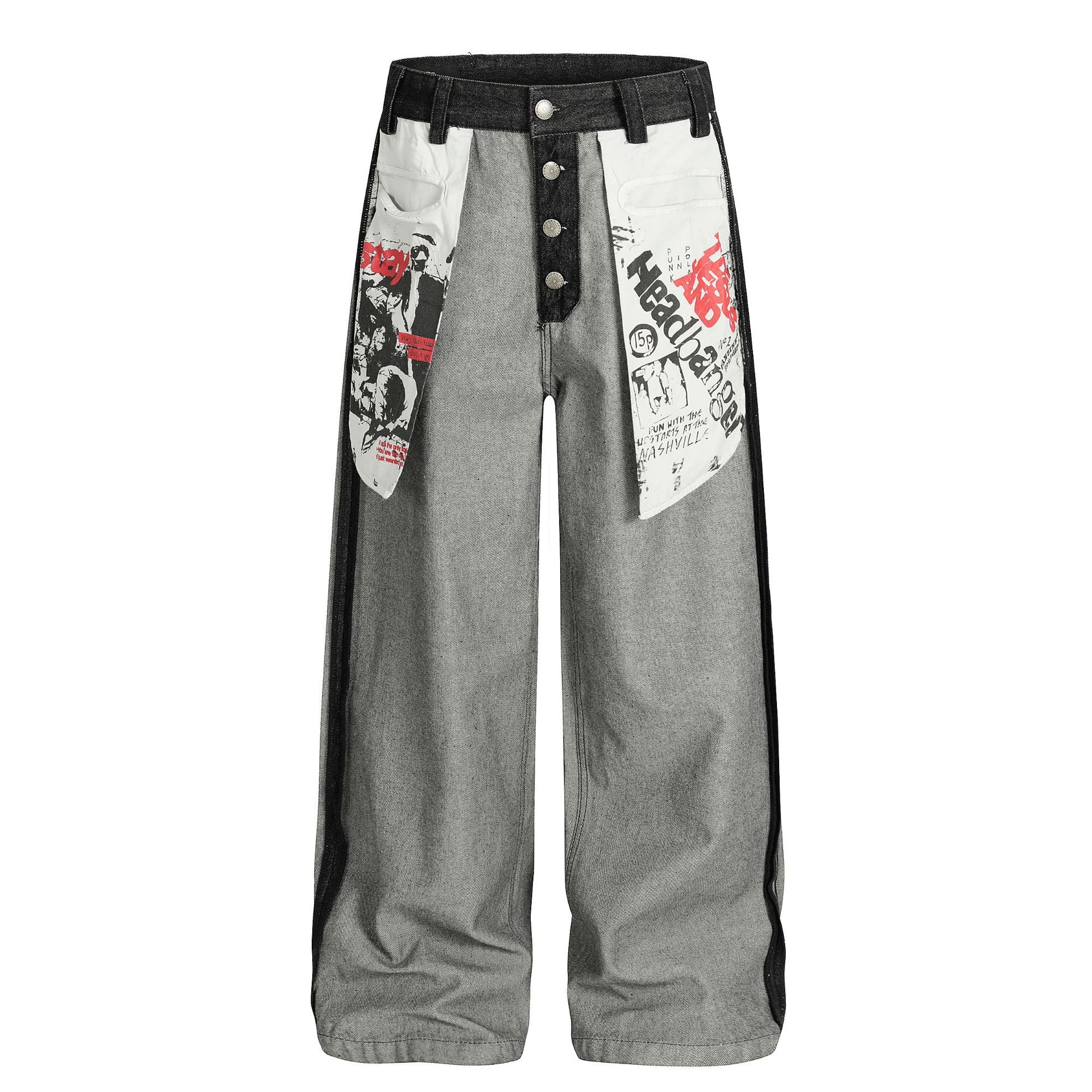 Street Style Printed Deconstructed Asymmetrical Design Loose Fit Unisex Jeans
