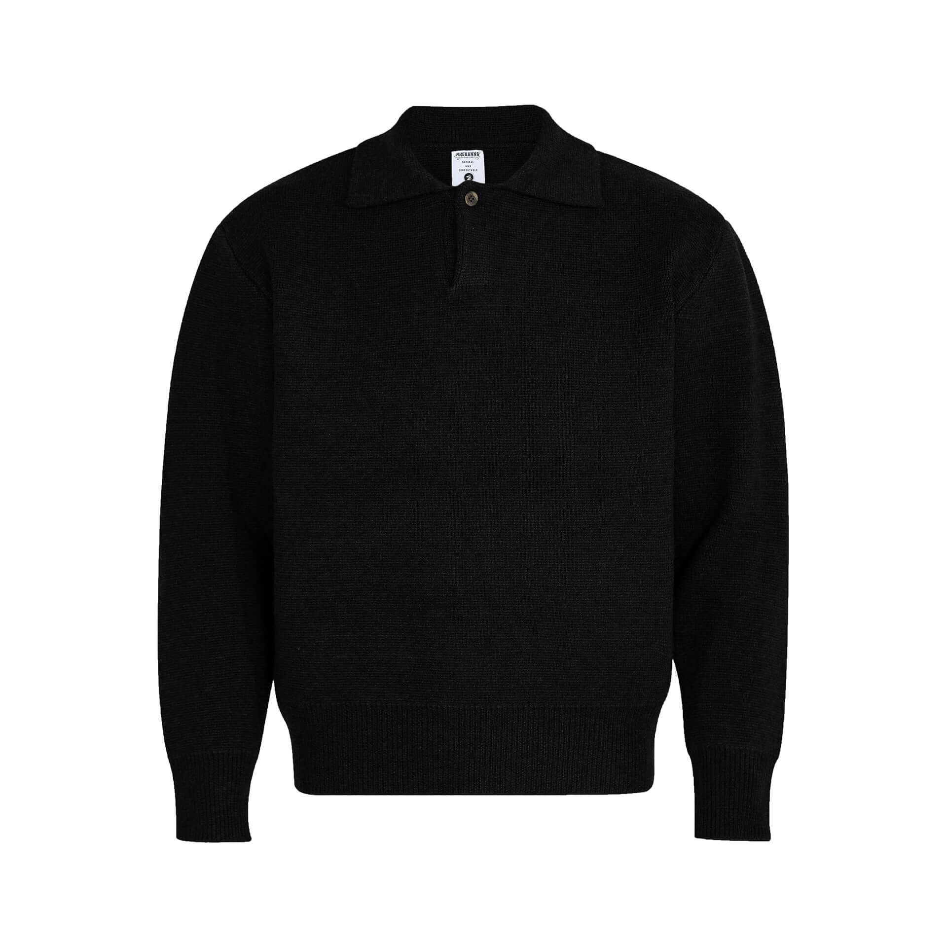 • Notch Lapel Knit Sweater - Loose Fit in black with a flip collar and a relaxed stitch design.