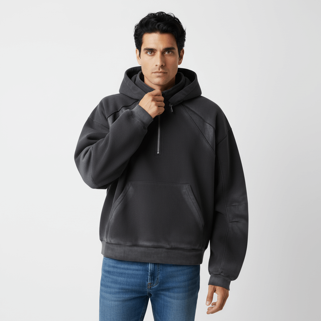 Designul cu guler înalt și fermoar pe jumătate adaugă versatilitate și un aer modern, permițând un stil ajustabil în timp ce îmbunătățește căldura și confortul. Cu silueta sa relaxată unisex și mânecile lungi, acest top casual este ideal pentru a fi purtat în straturi sau singur. Disponibil în Negru și Gri, se potrivește ușor cu blugi, pantaloni cargo sau joggeri pentru un look de stradă încrezător, de zi cu zi.